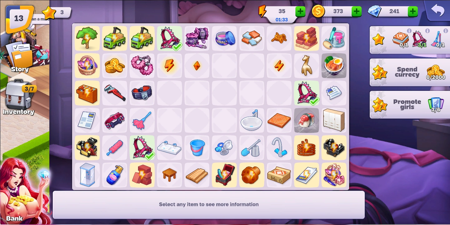 From the very start of the game you get into your mansion, get the first girl and get to work. By pressing the “Play” button you are transferred to the playing field. The gameplay is simple as hell. Since Horny Villa belongs to the Merge genre, we have to combine the same items.