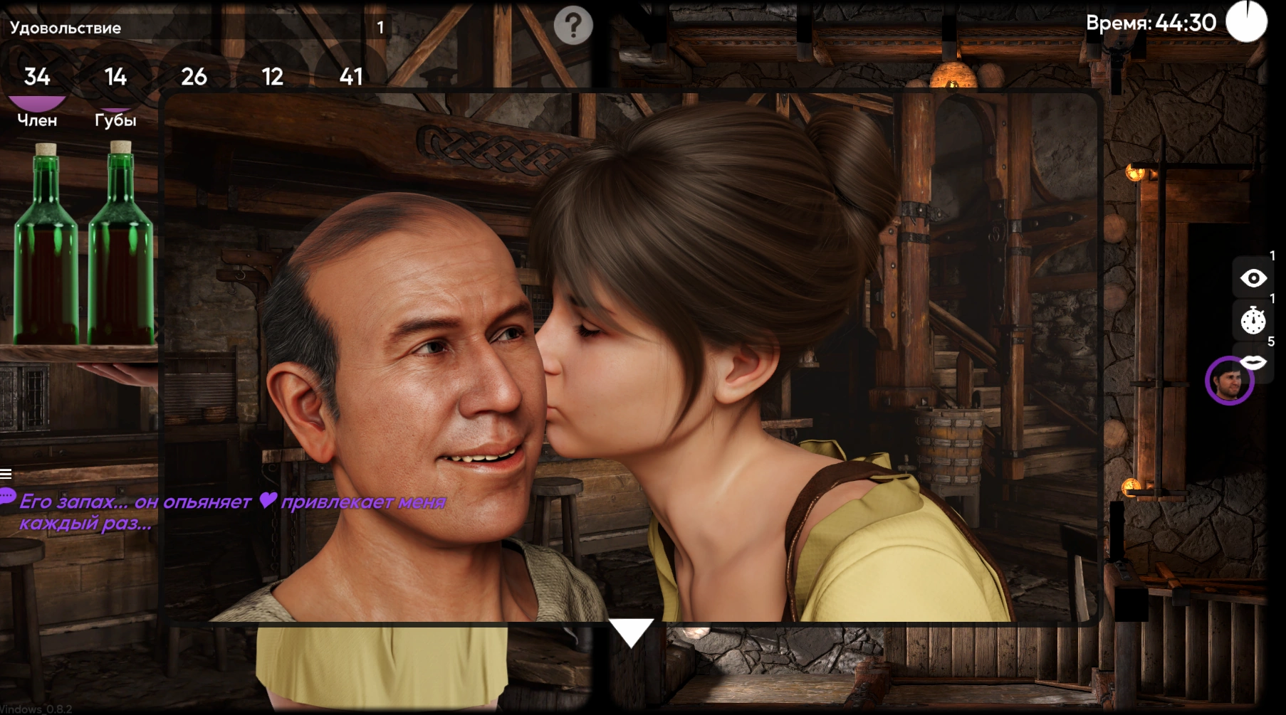 At the moment, most of the content in Corruption Town is devoted to voyeurism – while we are walking and delivering drinks, visitors are slowly groping the main character and taking off her clothes. When certain conditions are met, full-fledged action scenes take place, so if Agnes gets drunk during her shift, she serves the entire tavern, and if she works her shift well and gets enough tips, a rich man’s service scene will occur.