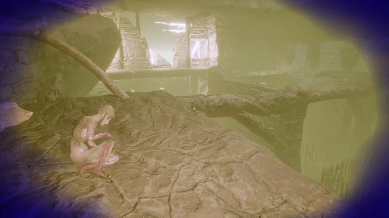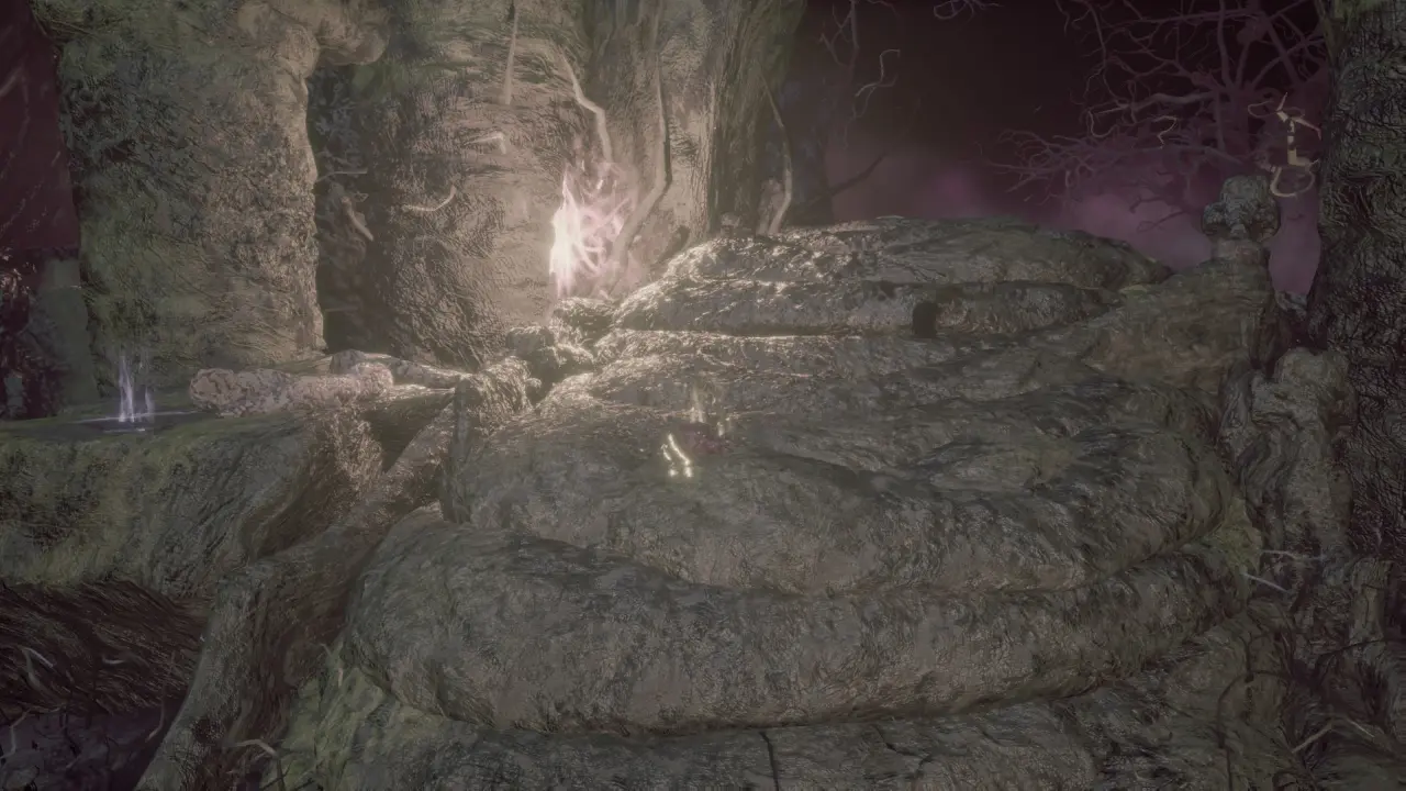 To find the Stairs Painting, proceed past the Cauldron area, as if you were going to the Goddess statue and the Fractal Forest. If you get to the statue, you’ve gone too far. While you are on the vine/branch walkway leading to the statue, there will be a subtle gap in the stone and underbrush. This is what it looks like: