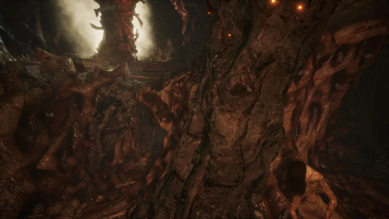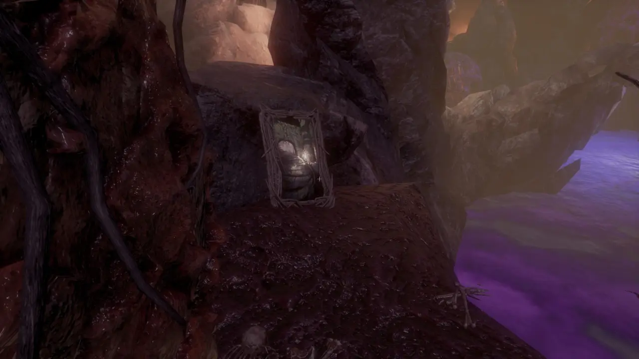 So, lets start with the Hanged Man painting. Bring a torch, as that will make this task easier. Work you way over to where Baphomet and the screaming man are. You will see an island with three Martyrs chilling out together. On this island is a large purple branch. Climb up the branch and jump to the next island, which is covered in spiders. Quickly walk forward to the next island, which is small and has a broken bone gate on it. From here, you should be able to see this:
