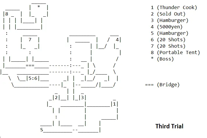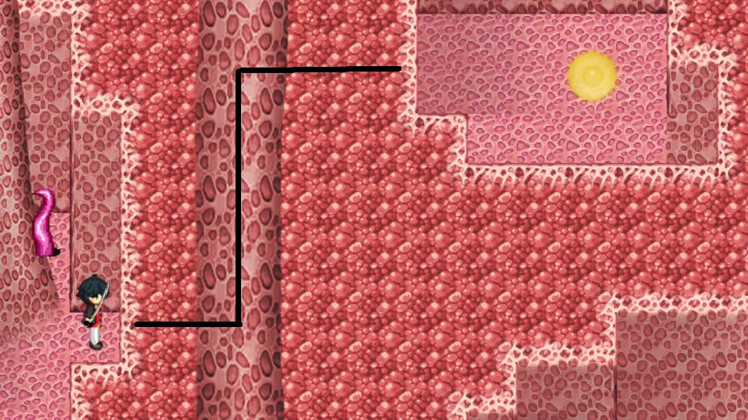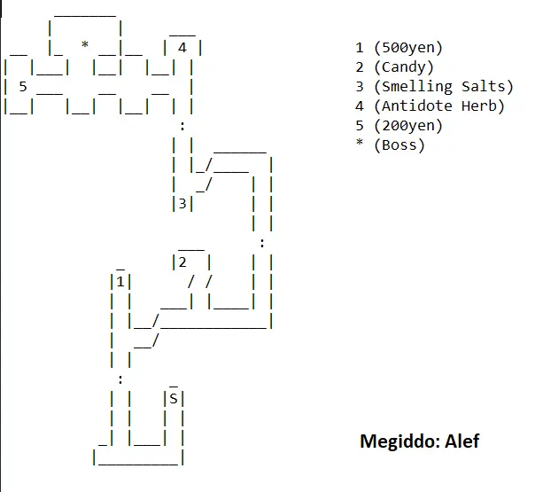 Head down and follow the path to the next area. Head up at the intersection to see your first orb, the blue orb contains “500yen”. Head back to the intersection and go right, then up again for a green orb that contains a “Candy”. Head right to the next screen. Follow the bath around and head down at the intersection for a green orb that has “Smelling Salts”. Head up to the next area. Straight up is a green orb for “Antidote Herb”. Take a left at the intersection and another left at the next one; there is a blue orb for “200yen”. Take the path up for the boss.