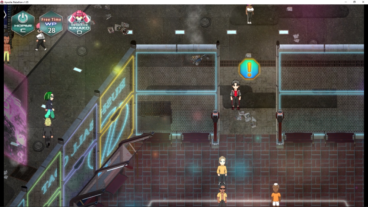 Give him 2000 bits. Then run one screen to the right and down a little on the crossroad and talk to the patrolling policeman. Then take the Taxi to Neo-Akiba, get into the Game Bar building, and talk to the scammer.