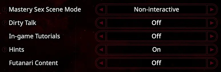 I also recommend turning Dirty Talk off. Dirty Talk is an icon that appears on the left side of the scenes. Like the mini game it takes you out of the scene and doesn’t really add anything to the scene.