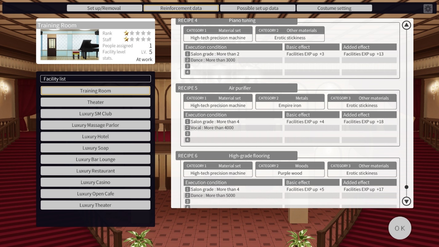 “Salon grade” refers to your club’s grade/star rating, which increases as you progress in the main story. “Elegance” is sometimes mentioned in upgrade prerequisites, but it’s simply another word for the “grace” stat. There’s not a whole lot to say about this, but I actually don’t really recommend buying up all the facility upgrade materials since having every option makes the actual upgrade process a bit more convoluted. Instead, consider buying the top one or two materials of each type from the CR shop, plus the materials from the casino. Later in the game, the most important stat in your facilities is going to be “Facilities EXP up.” Guest ratings (referred to as ranking in the mgmt menu) cap at 999, which will happen pretty easily once your club gets rolling. Moreover, once you start upgrading facilities to their luxury levels, income stops being an issue entirely (you might have noticed in one of my earlier screenshots an inane amount of CR, heh). I assume some people can and do eventually max each job class on each of their maids, but doing so would take a lot of time. Either way, job exp will usually be much more useful than reviews and income.
