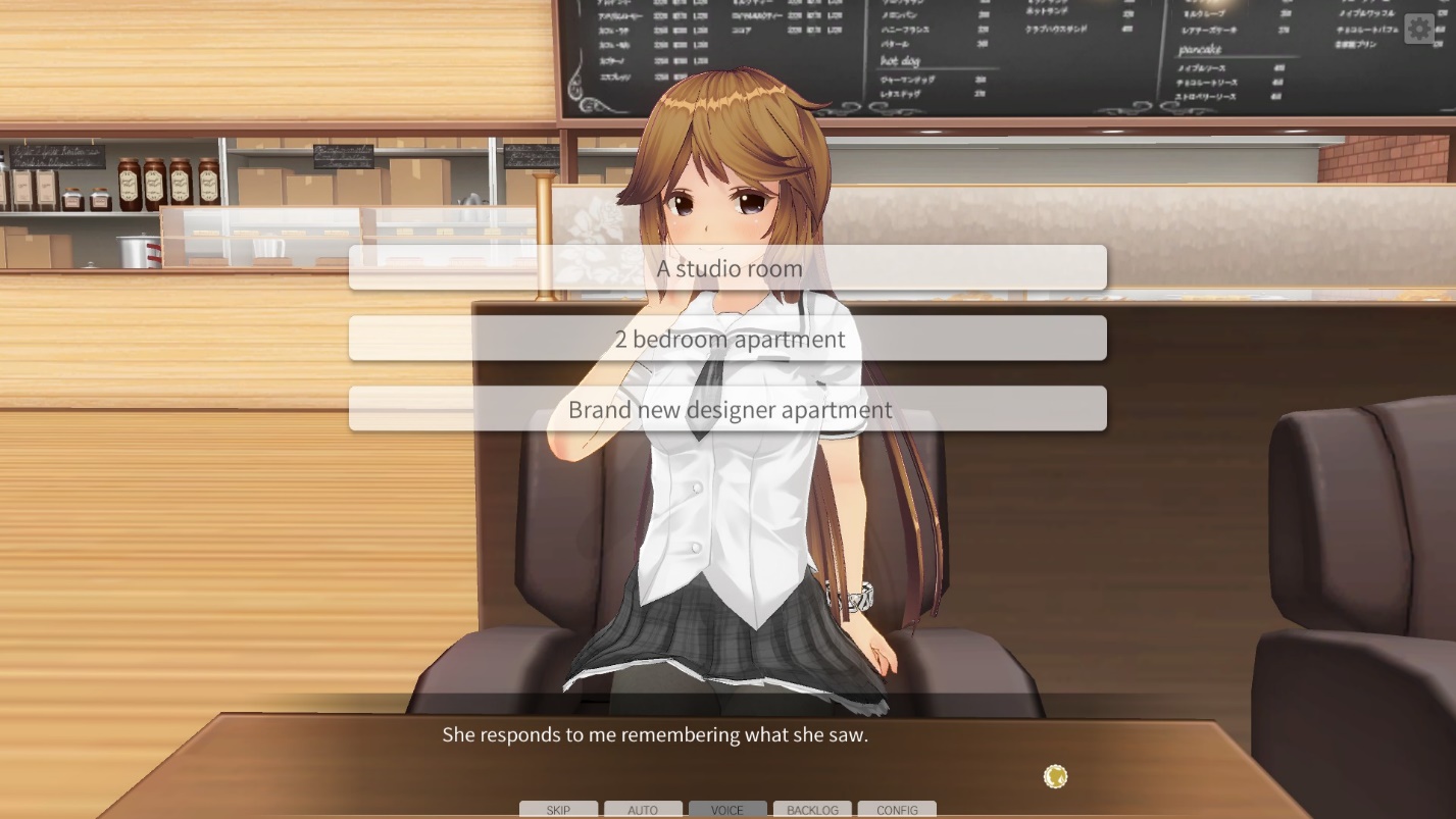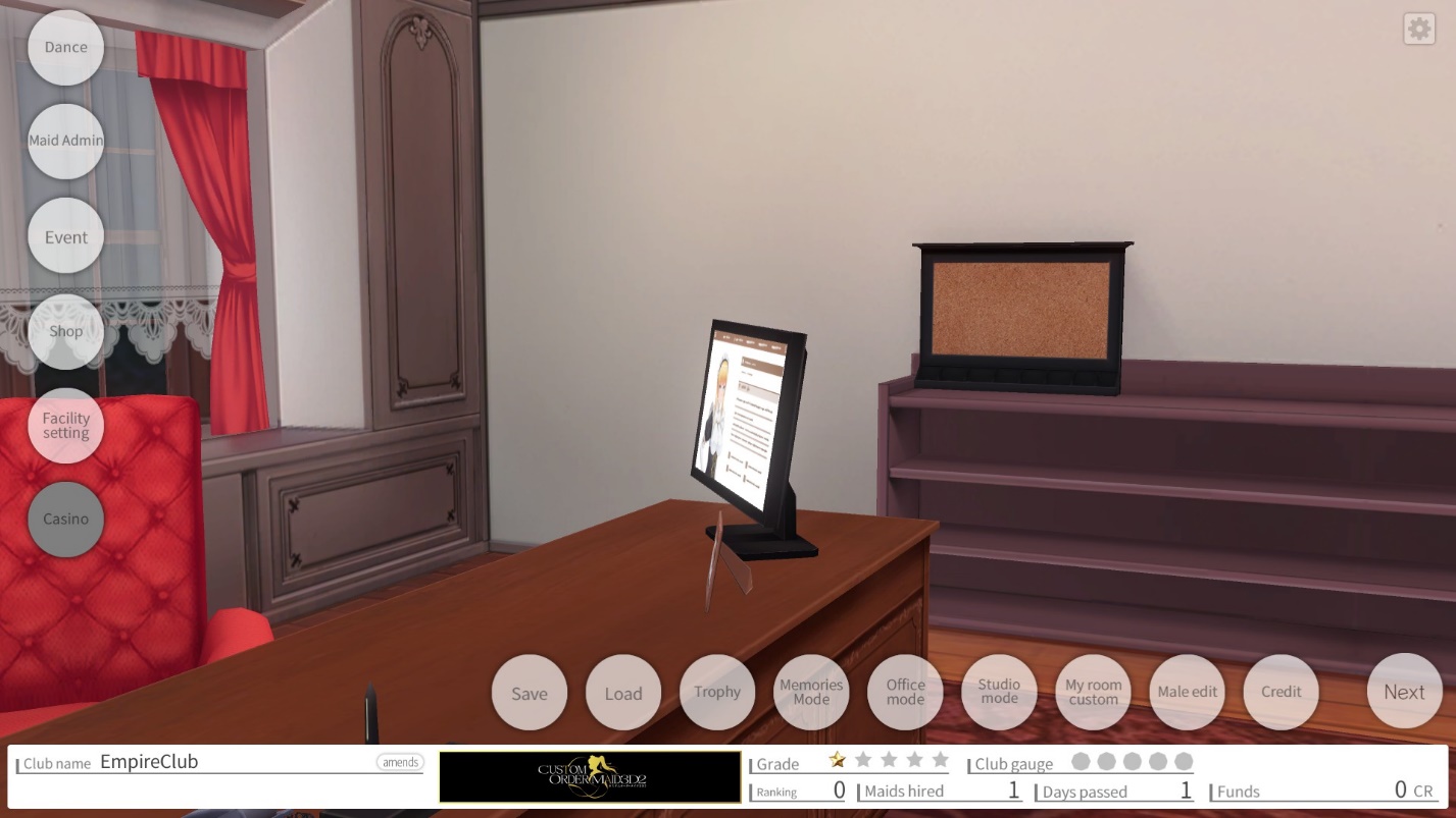 The Shop option allows you to purchase a few extra outfits as well as facility materials which you’ll use to upgrade your club’s facilities. There will be other places to buy and unlock stuff, but this is pretty much all we’ve got to start with. Facility setting is where you can add facilities to your club (which will cost CR), check their stats, and change their costume settings. Trophy gives you a few in-game achievements which grant you maid points. Use maid points to boost the starting stats of custom-ordered maids that you hire later on (this isn’t hugely important, although it does often unlock extra dialogue options in the initial interview. They’re listed as features in this screenshot). Memories mode allows you to re-watch events you’ve already seen. Office mode allows you to add a few items to your office to decorate a little bit. Select an item from the list and check the Indicate box. You can move items around, but it gets a bit messy so I usually leave them in their default spot. Studio mode and my room custom are options for putting together your own scenes. From what I’ve seen, it’s fairly robust… but I haven’t really bothered with it, so I don’t have anything to say here.