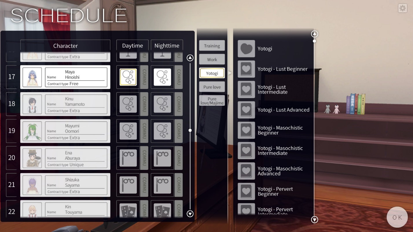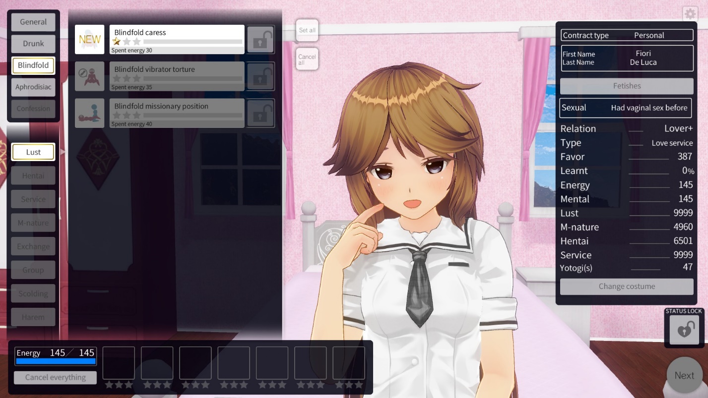 You determine the lineup of yotogi skills before you start. Each skill will spend different amounts of energy (with more specific, higher-level skills costing much more energy) and often have different options and dialogues from the rest. Spending a girl’s full energy results in her fainting after yotogi is done, which causes her to fail her next non-yotogi action (only ~50% stats gained from training or CR made from work). The highest H parameter a girl has determines her “type” (masochistic excitement, extreme pervert, love service, sensitive, etc). As H parameters go up, it will unlock pre- and post-yotogi dialogues with the girl.