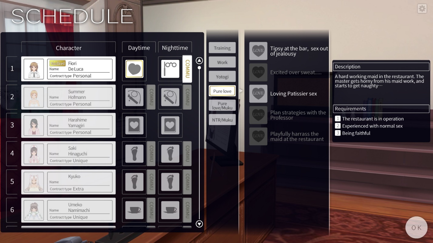 H scenes will be available under the schedule in the mgmt menu. There is a pure love route as well as an NTR route, and hovering over it will show what its requirements to watch are. Note that three of the H scenes in the pure love route unlock at trust relationship (JP: 信頼である which the game also translates to “faithful” here). This means that if you waited til the MC and one of the maids became lovers to take her v card that you’ll be missing out on three of the H scenes. However, the pure love scenes between the three main girls are basically the same, and after watching it with one you can view it with the other two in memories mode, regardless of what your relationship with that girl currently is.