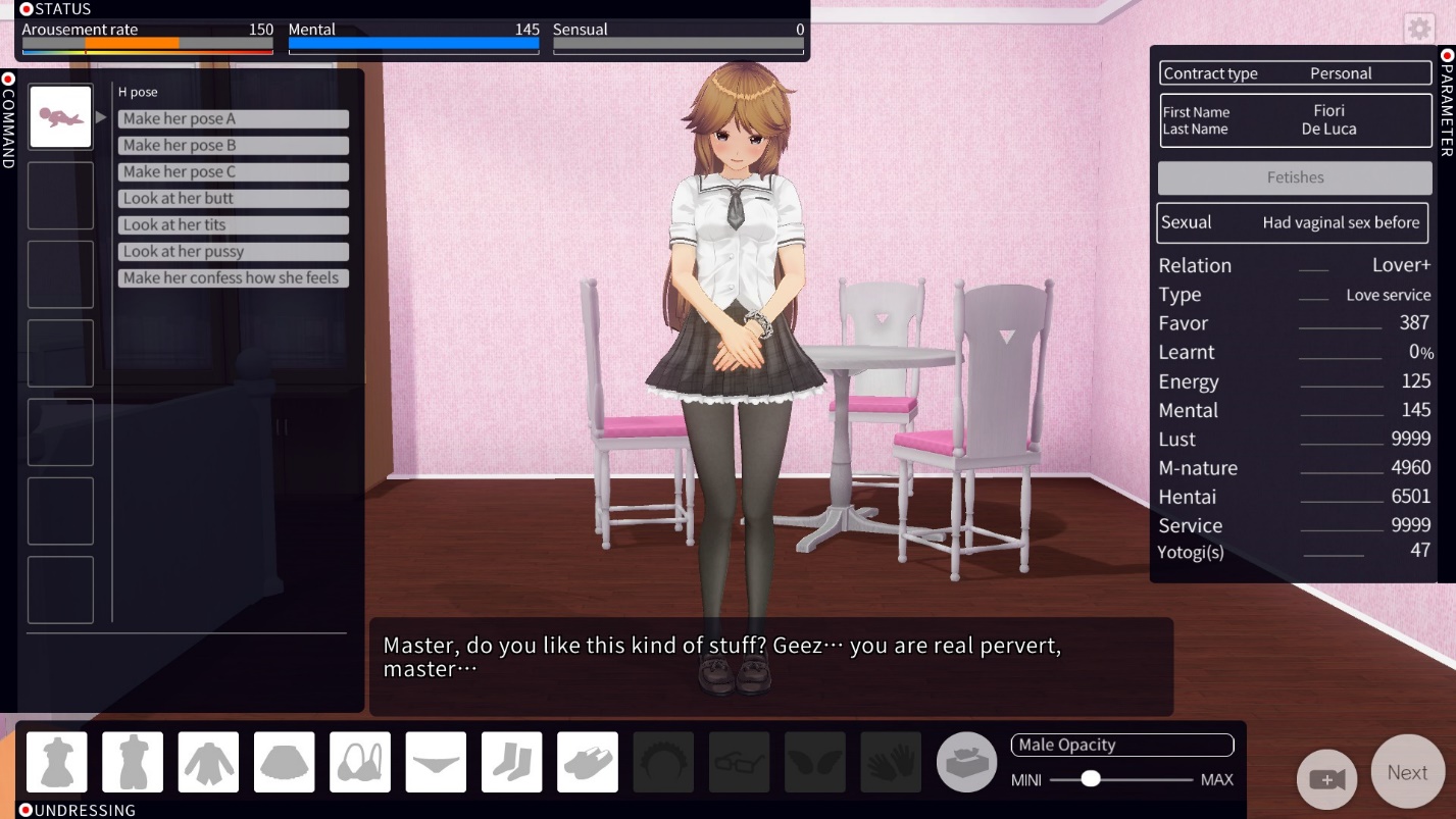 The international and English versions of COM3D2 have added both the “cautious” and “lover+” relationship levels. This doesn’t ultimately make much of a difference except via adding more events. The cautious events are about a maid getting to know the MC and lead up to them being friends, while the lover+ events are simply cute scenes about the girl being lovey-dovey with the MC. For the main girls and custom-ordered maids, favor can be increased either via the commu function or via talking before yotogi. For unique maids, commu is the only way to manually raise favor (although progressing through their events seems to increase favor, too). While you can raise the favor of extra maids, there isn’t really any point since there are no scenes unlocked with these characters.