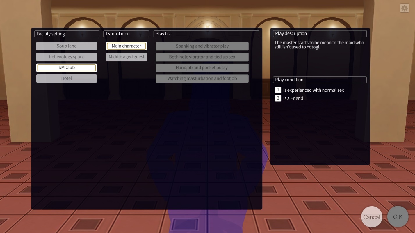 The first thing the game asks you is whether you want to turn on the NTR blocker. NTR (Netorare) is cheating. Since you’re managing a club with maids as call girls, it’s not unreasonable for someone that isn’t the MC to be with one of your maids. Turning on the NTR blocker removes a large chunk of content from the game, more or less turning it into a great big harem. Soap land and SM club can be built for the master, but won’t be legitimate facilities (can’t be leveled or improved and your maids can’t work there) and only add places for you to do yotogi with your girls. You can’t turn NTR blocker back on if you’ve turned it off, making it a one-way street. I’ll quietly point out that with NTR blocker turned off, having girls work in either Soap land or the SM club doesn’t change their sex experience. Maids with v cards keep them until you take them in yotogi, no matter where they’re working. Oddly enough, this is true of Guest Mode, too.