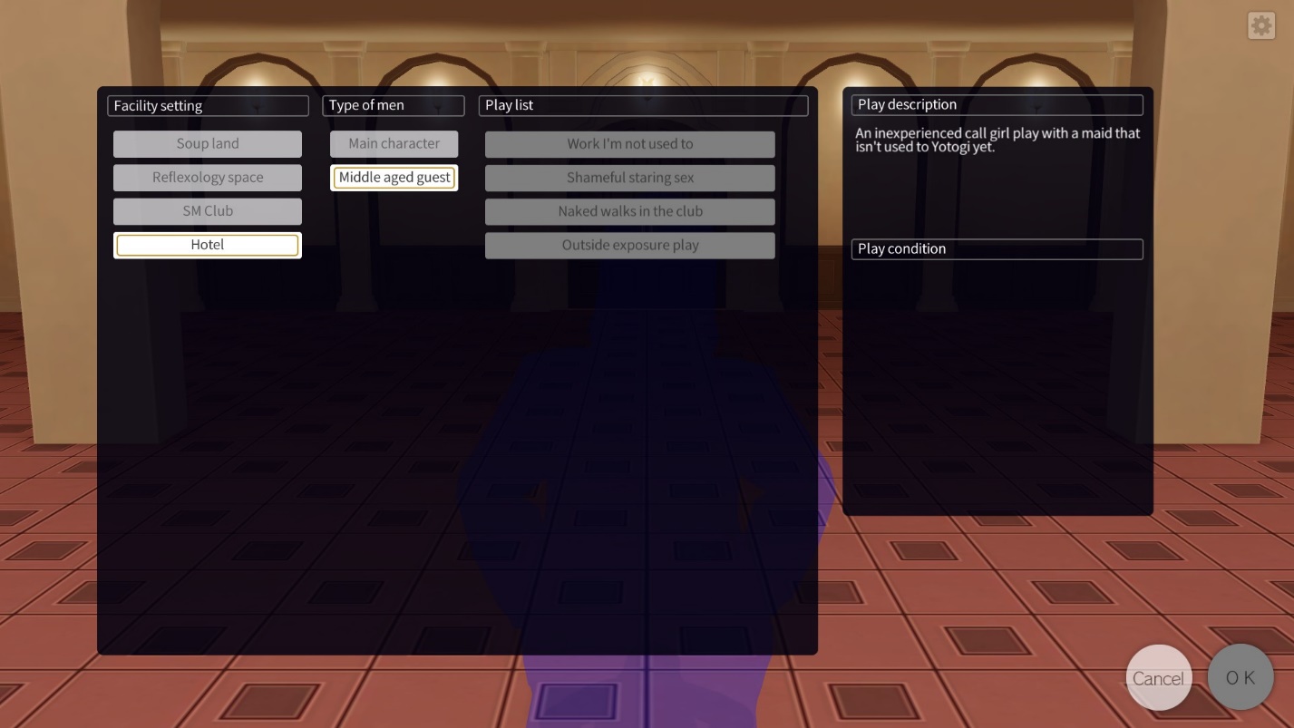With NTR blocker turned on, middle-aged man won’t be an option, meaning Guest Mode is limited to the MC pretending to be a guest. Oddly enough, middle-aged man can select any of your maids, regardless of whether their contract is exclusive or free. I’ll also add that it’s impossible for either the MC or middle-aged man to take your maid’s v card in this mode. Some scenes have no prerequisites, meaning virgin call girls can proc them. The maid generally just tells the guy “But I can’t,” and they finish the scene in a different way.