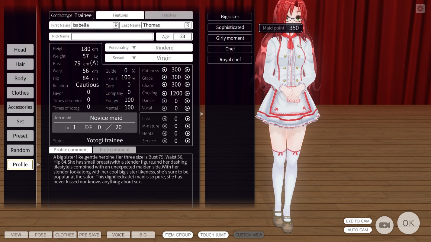 As a quick aside, you are somewhat able to get around the restriction on extra maids not being able to yotogi. Going to Maid Admin > Character > Edit > PRE.SAVE > DRESS/BODY (at the bottom of the screen) will allow you to save the likeness of a character to the presets in the character editor. From there, you can hire a new maid from Maid Admin and load up the extra maid’s preset (assuming you’ve already unlocked the character options and clothes her design uses). The main downside to this is that you must pick between the three main girls’ personalities, which means you lose out on the extra maid’s unique voice acting. The JP version of COM3D2 has a few extra personalities, including some that are transferable from CM3D2. Since CM3D2 currently can’t connect to the English version of COM3D2, I would hazard a guess that most of these personalities will be added to the game as DLC somewhere down the line (once they’re translated or what have you).
