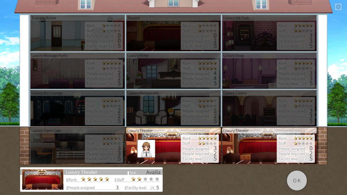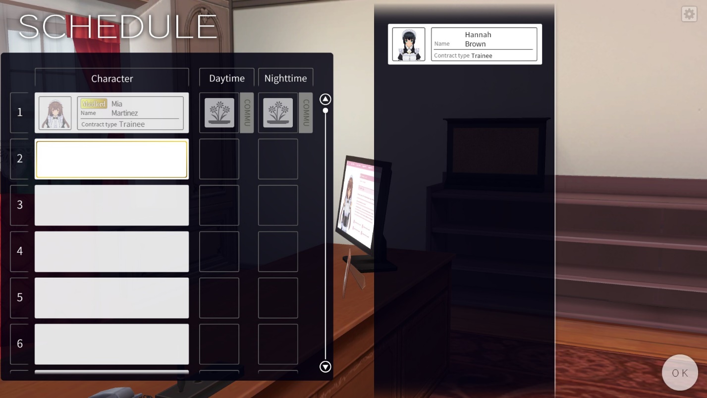 After being introduced to your second maid, you are taken back to the management menu. Click on scheduling and select one of the blank white boxes and you’ll be able to add her to the schedule. Right-clicking on one of the maids here allows you to delete them from the schedule (the same technique is used to delete save files or character presets you don’t want anymore). You can also click and drag a maid to move her up and down in the list in order to better organize your schedule. Click on one of the maid boxes afterward or the game won’t scroll properly. I try to keep maids grouped together based on which facility they’re working in, since the list feels a lot less overwhelming that way. Feel free to train your maids, have them work in the Theater to make CR (you must click and confirm the specific facility you want them to work in, since it’s possible to have duplicates of the same facility),