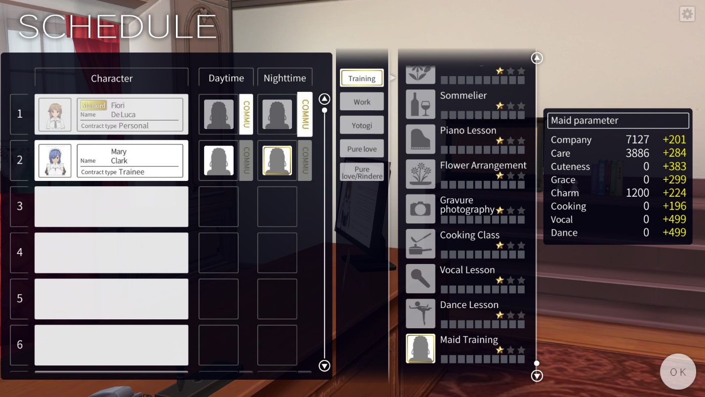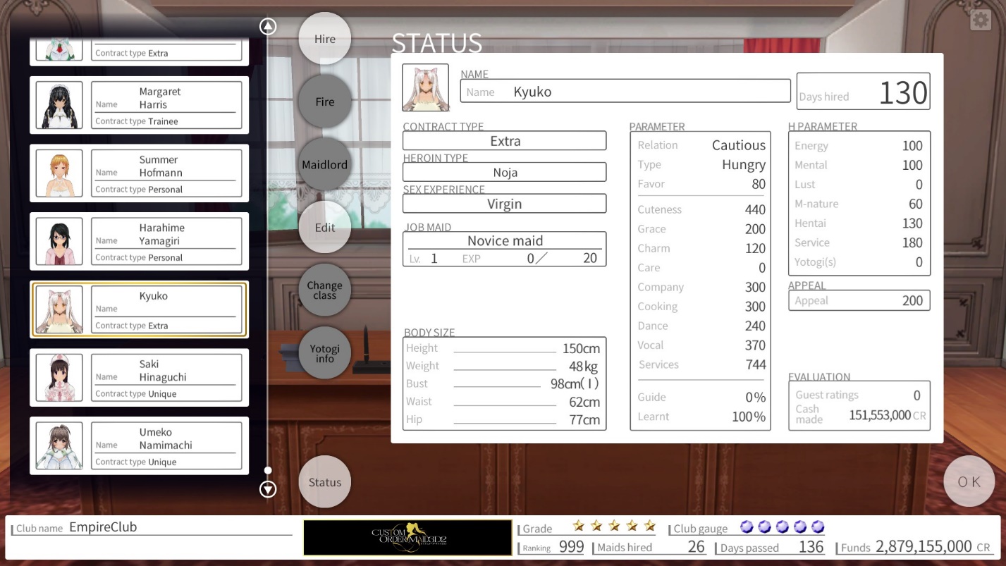 A maid who has been given either an exclusive or free contract can be made into your Maidlord. At the beginning of the game, this will instead default to the first girl you’ve hired (despite her also being a trainee). Trainees you have can be given a special “Maid Training” option by the Maidlord. This occupies both the trainee in question and your maidlord for both daytime and nighttime, and yields a percentage of the maidlord’s parameters and skills to the trainee (everything but services and H parameters). It’s worth noting that you can highlight commu for either the maidlord or the trainee while maid training is being done. Also, only one trainee can be trained like this at a time, since it represents one-on-one tutoring by your maidlord.