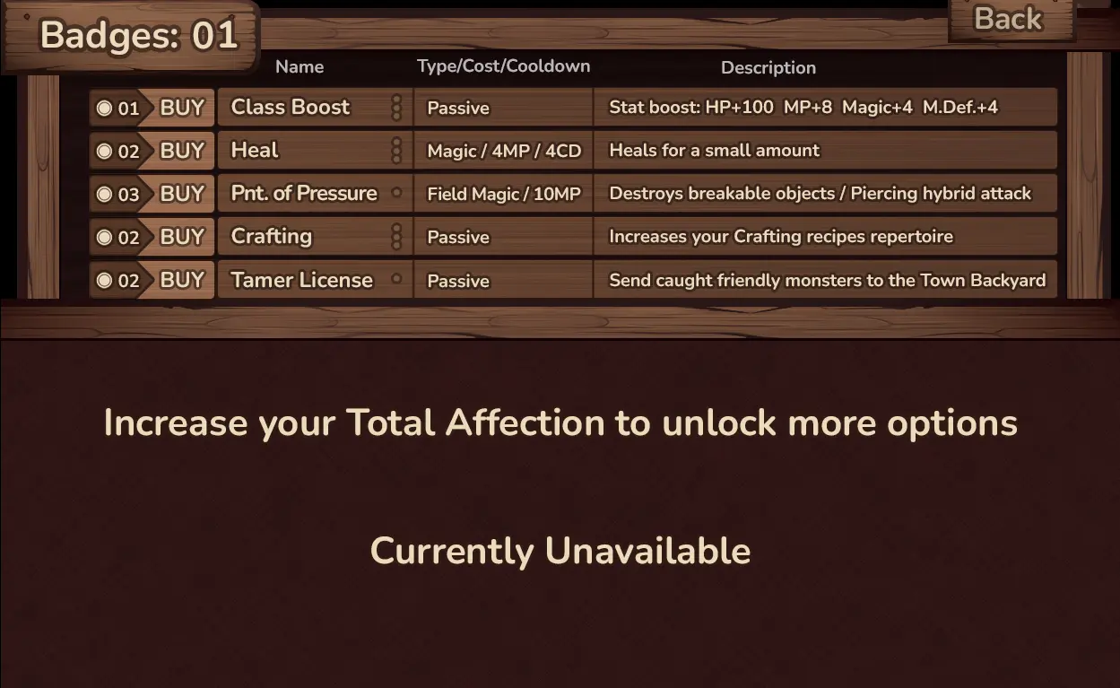 In this menu you can exchange badges for upgrades, these can be skills that have a passive or active effect as well as useful key items for the journey