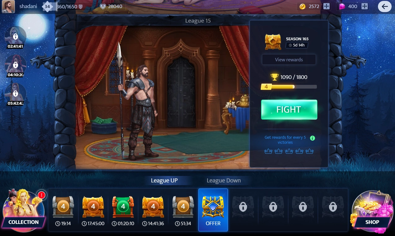 A newcomer starts from the 15th league and quickly rises to the top of it. For each victory over an enemy the game gives some gold and a chest, which, depending on the rarity, is opened from 5 minutes to 38 hours. Each league increases the number of girls in the chests and the amount of gold.