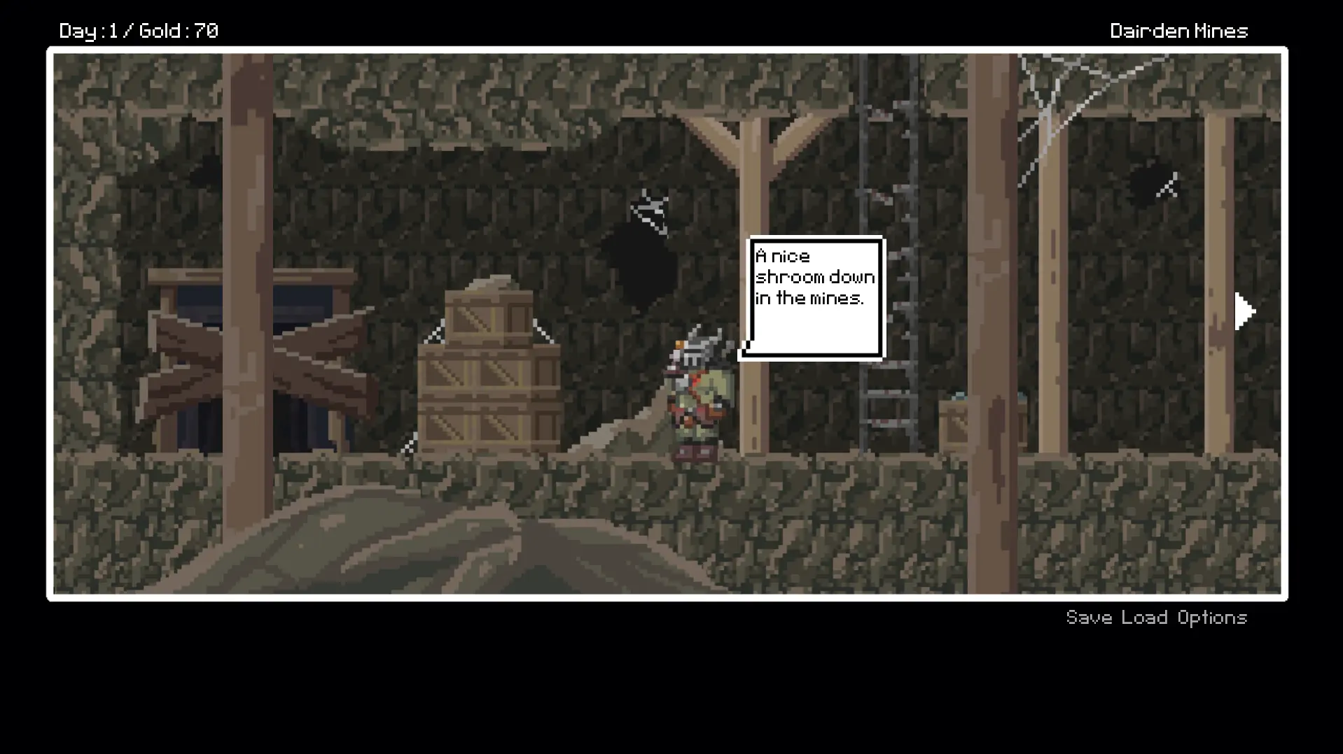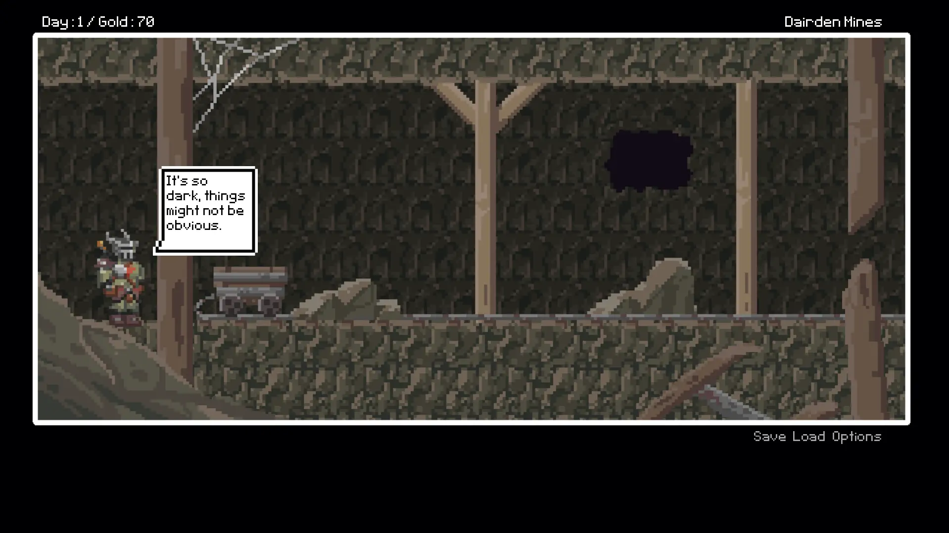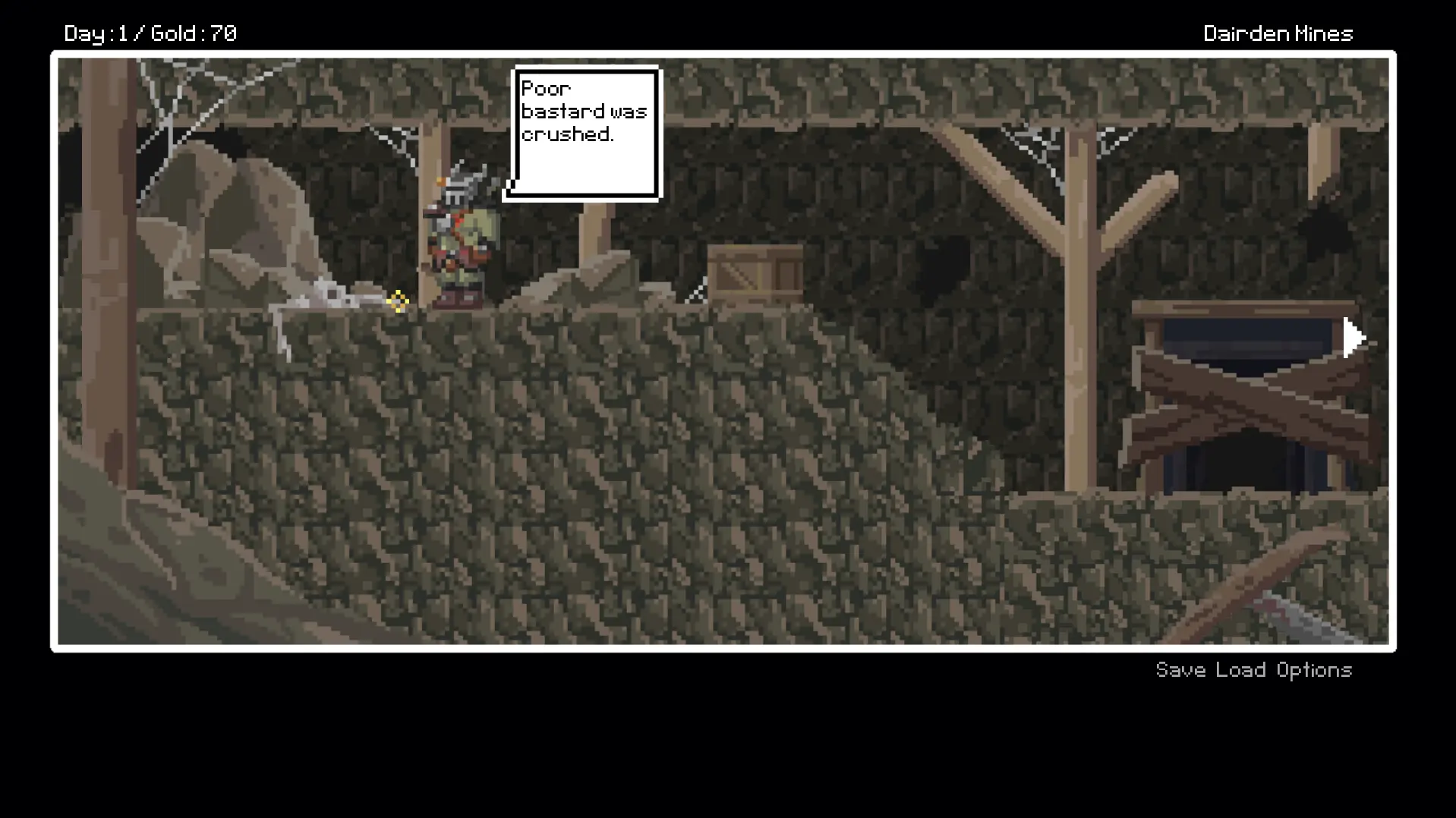 Two screens in and our orc will express his discomfort with being in an abandoned, collapsing mineshaft. No worries, it isn’t coming down on ya.