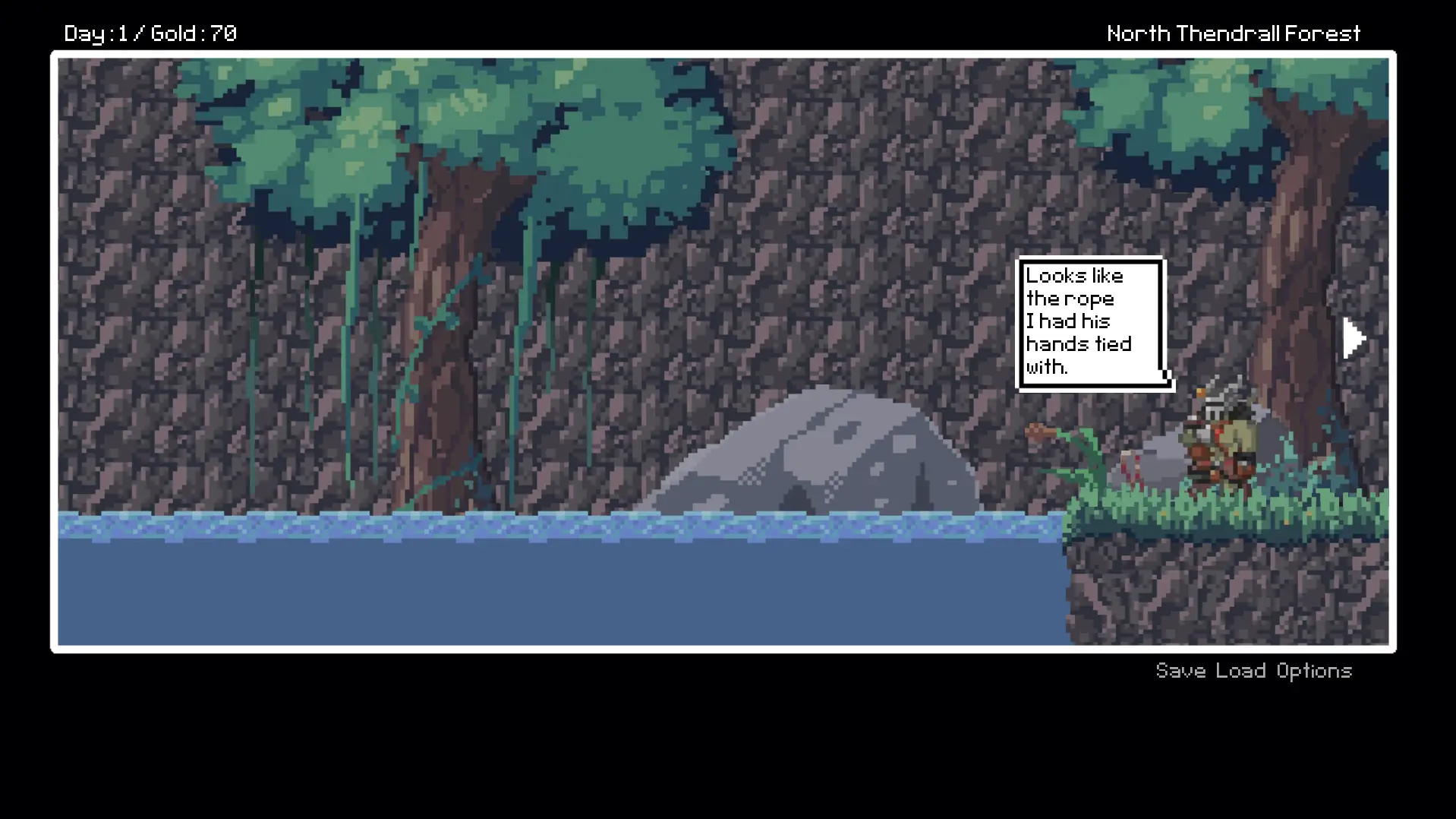 Here we’ve found what happened to our target’s binds, he’s cut them off on a rock. Trigger Event for more dialogue but nothing else here. Head east a few screens from here.