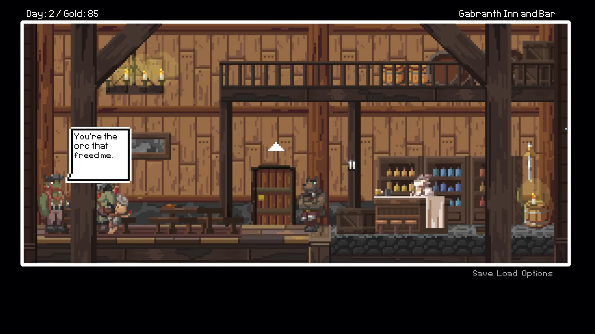 This day opens with a very naughty scene between our orc and the rescued Gerald. You get “Bounty Hunter” along with this scene, I believe. After a brief nap, we can rest easy – Gerald is safe and we can wrap up quests or talk to anyone we haven’t before we finish up the ending. At this point, we’re going to trigger the scene between to two men we met at the waterfall and then end the day.