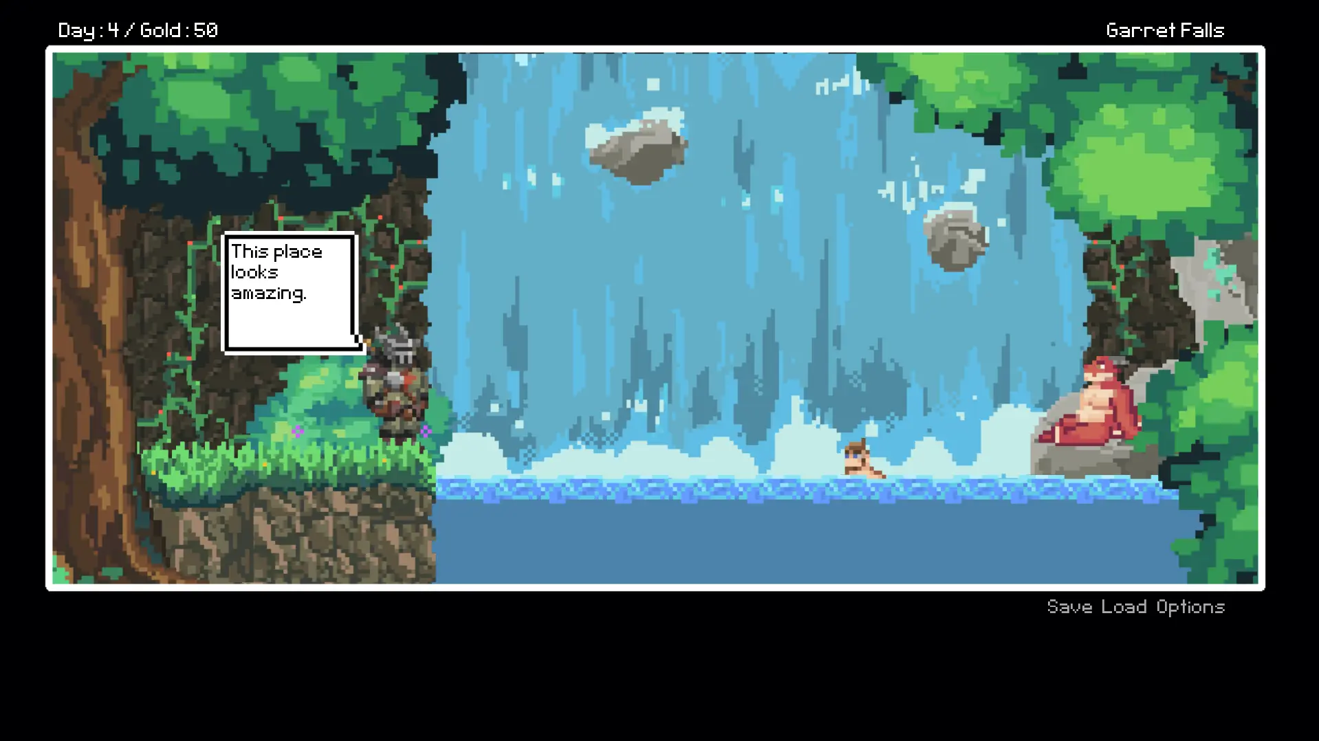 Down here you’ll see the waterfall the Innkeep mentioned earlier, where men sunbathe and swim nude. Of course, I can’t share that image in this guide, so this is what you get. Over across the way, notice this mossy patch. This is the ingredient we need to get for the alchemist, so tomorrow morning we are coming back to grab it. For now, double-back and open up the rock with your pickax. You should get the “Scenic Route” achievment here, but if not it might pop when you arrive tomorrow in the morning.