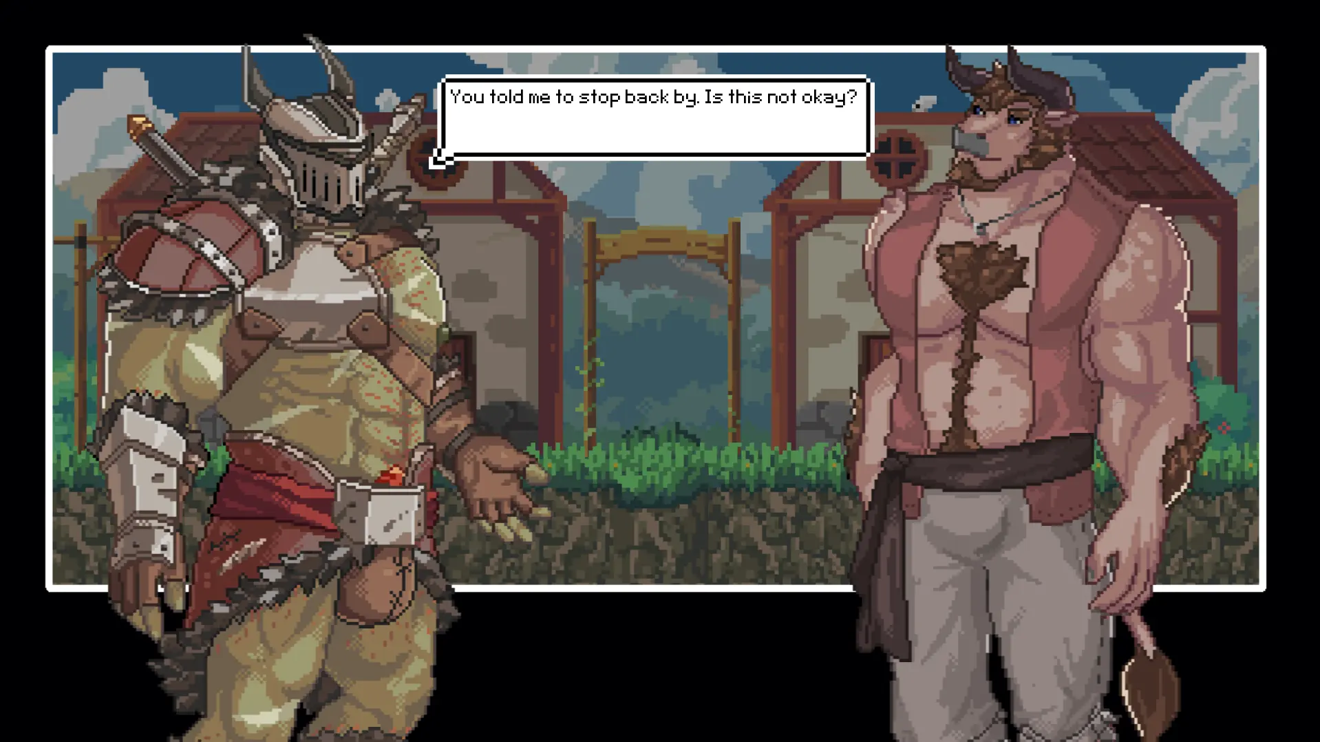Now, you should be able to skip to Day 8 or so if you have finished the events of the normal playthrough normally. Go visit Logas in the forest and if he is still there back off a screen and camp out till Day 9. Check again and he should definitely be gone at this point. you’ll get the “Scalawag!” achievement for not freeing him at all. After this, head back to our Minotaur boyfriend and let’s finish this ending!