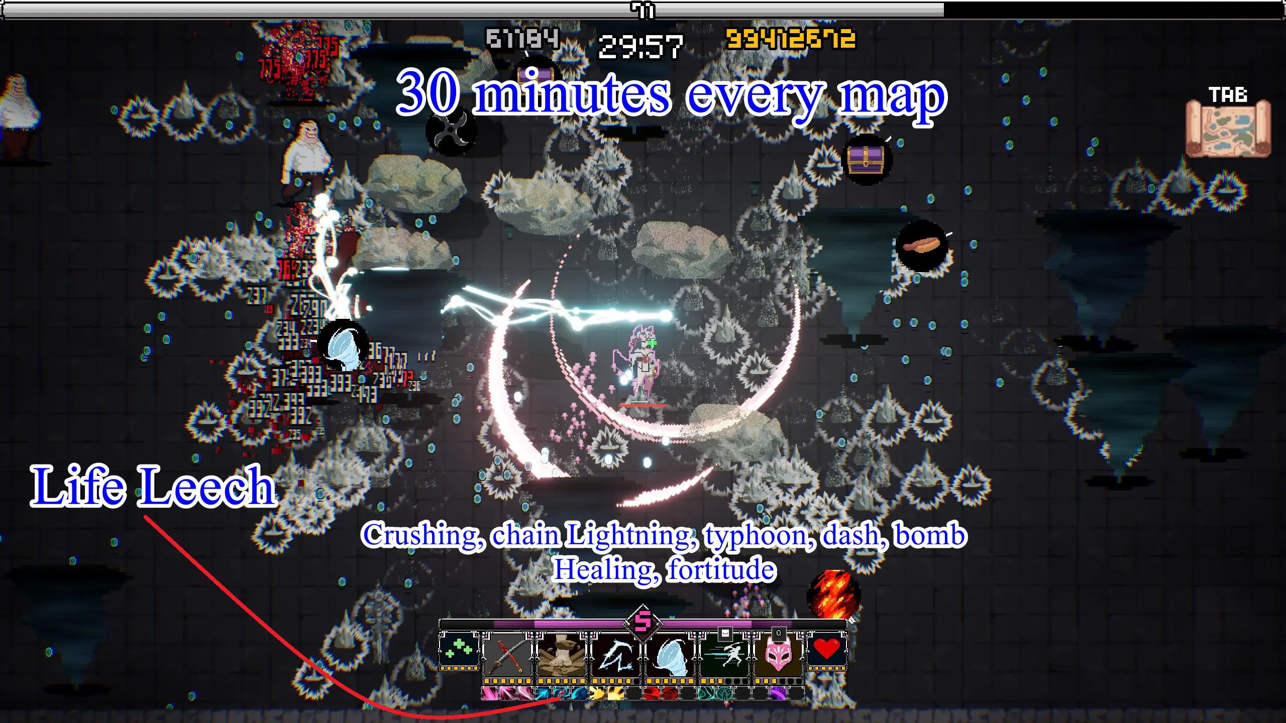 - Before the first big slime (elite) appears, stay around the start point and collect EXP, and upgrade weapons. If good weapons are not obtained, it is better to restart.