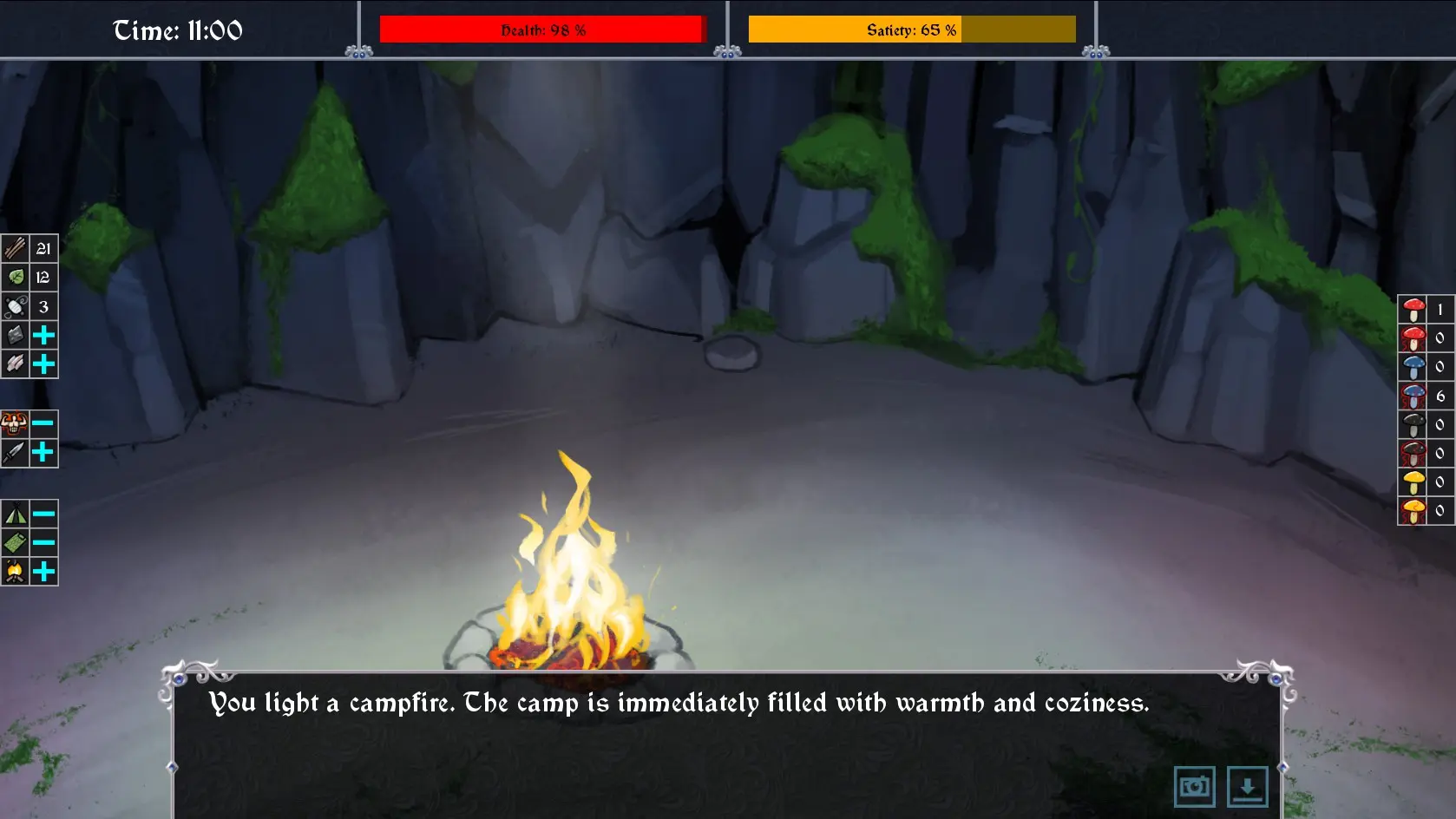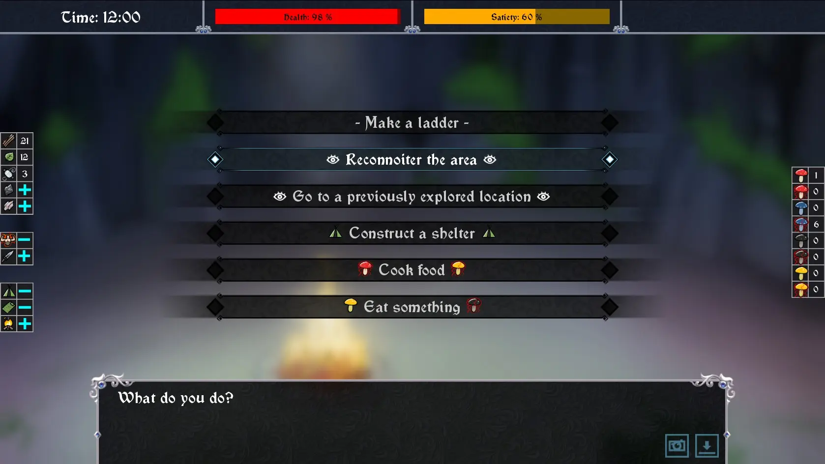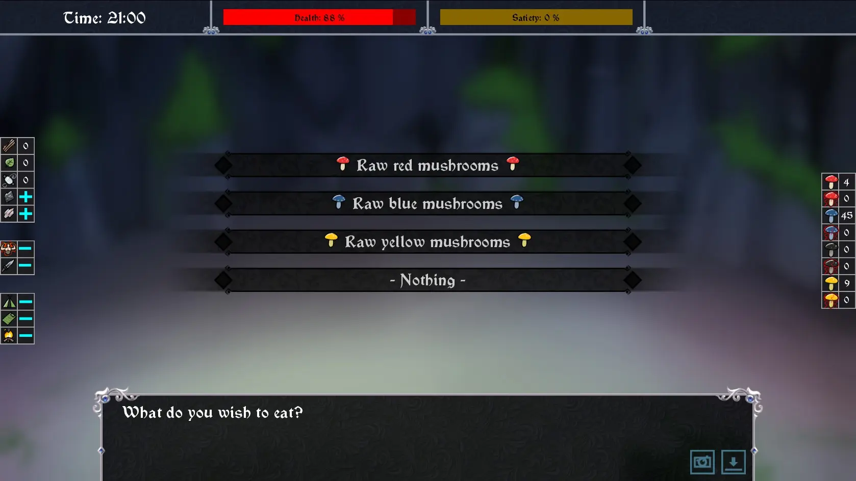 Day 3. Farm 7 branches, back and make campfire, cook 9 yellow mushrooms and all blue mushrooms. Then eat RAW red mushrooms.