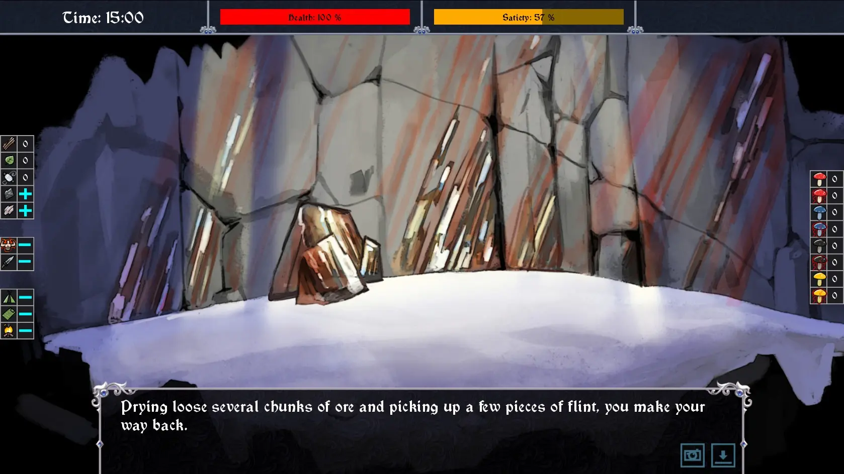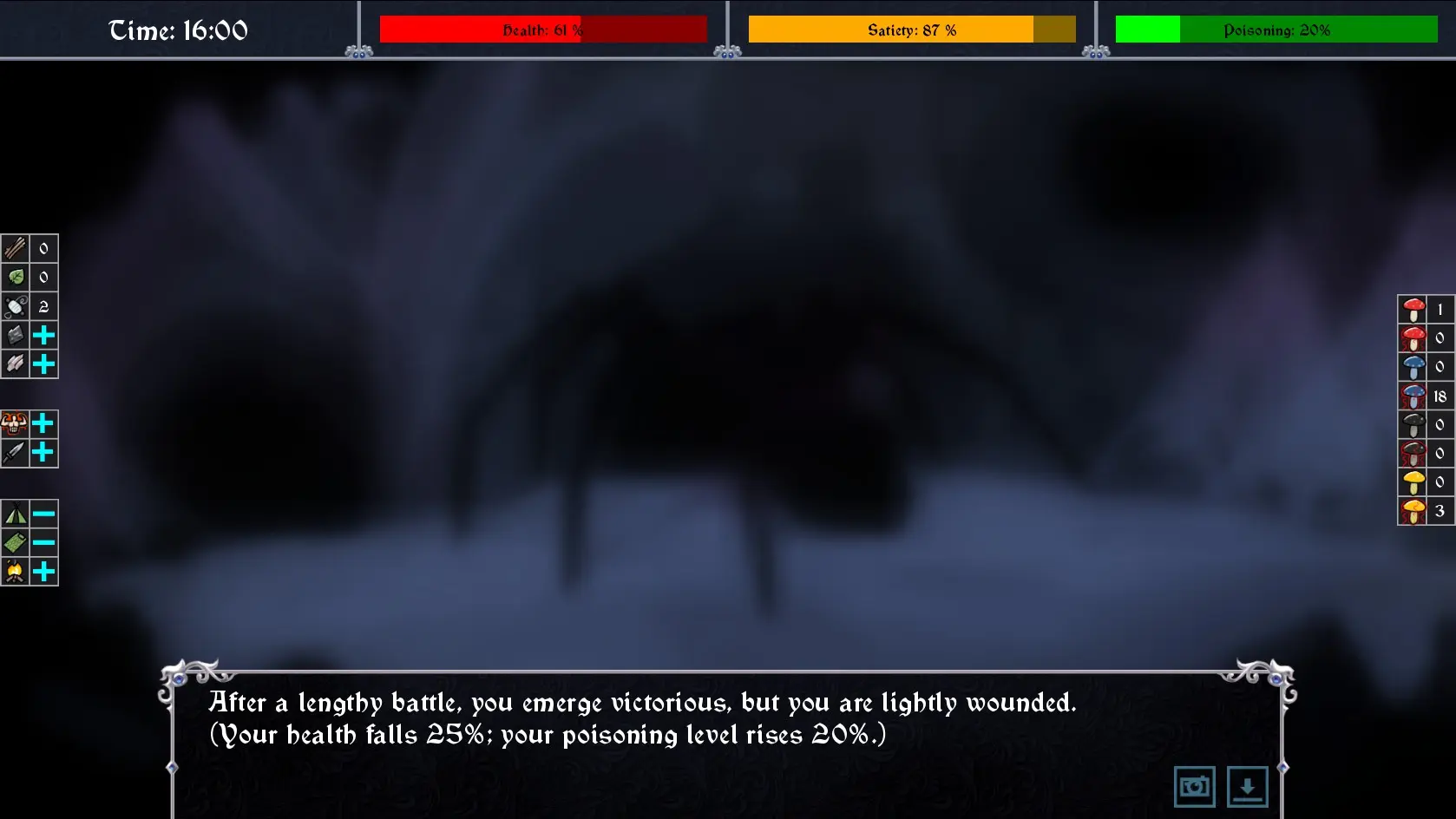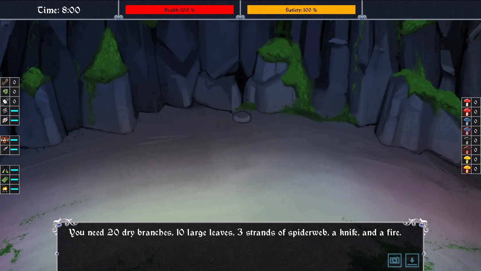 Day 3. Farm 7 branches, back and make campfire, cook 9 yellow mushrooms and all blue mushrooms. Then eat RAW red mushrooms.