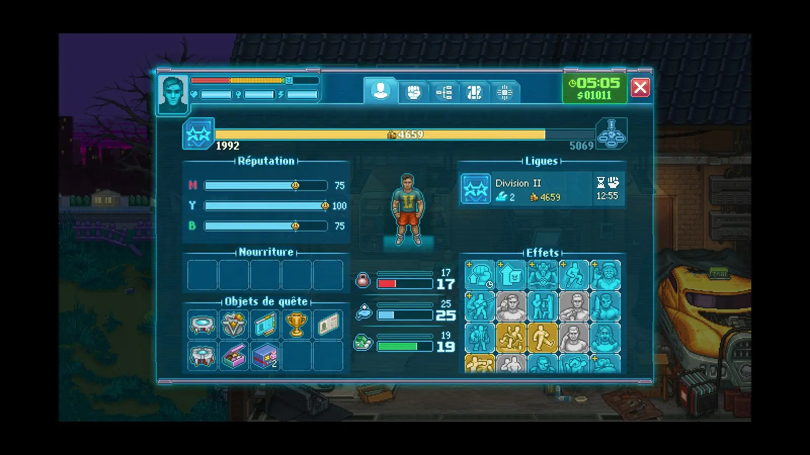 On thu uper right, you can see what time it is (some place are closed during some periods), your money, when your next fight is planed and – later in the game – more informations will be available.