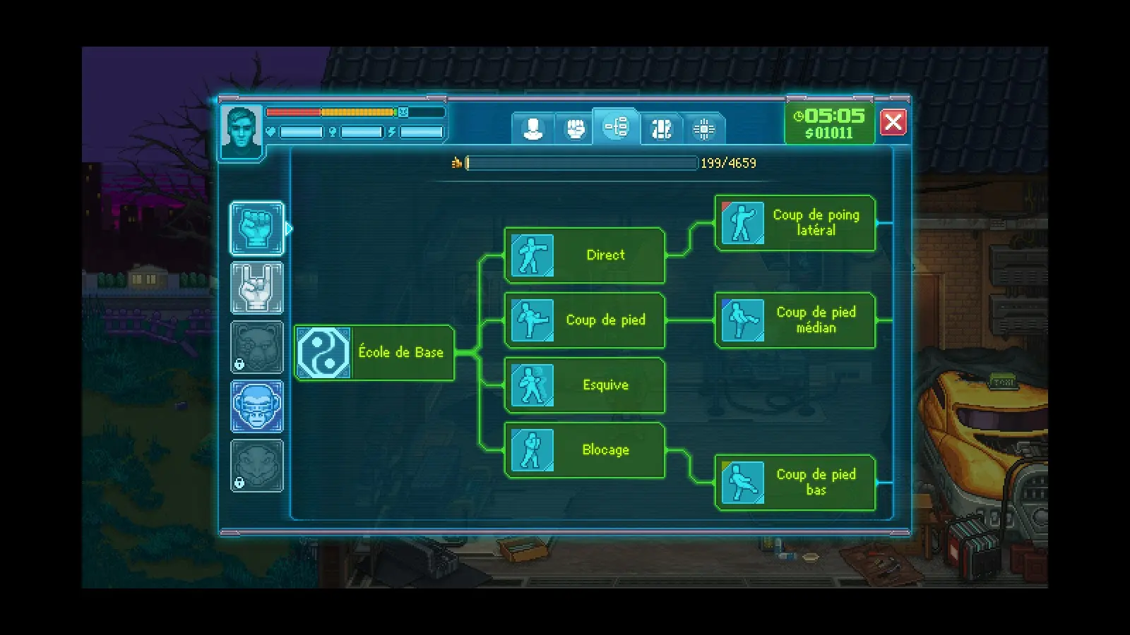 This is skill trees. you have 5 skill trees : the first one is basic school tree. available by default. It’ll let you learn some basic skills. You have to spend GPP points and have the required stat to unlock a skill. Note that available GPP is displayed on the upper gauge. completing this tree will unlock offensive school tree (bear head), agility school tree (monkey face) and defensive school tree (reptile head). those styles are focused on school specific skills. Just like the first punch club, it’s recommended to focus on one specific school (even if other schools skills can be interesting and give a good synergy. It’s up to you to see if it’s worh to invest).