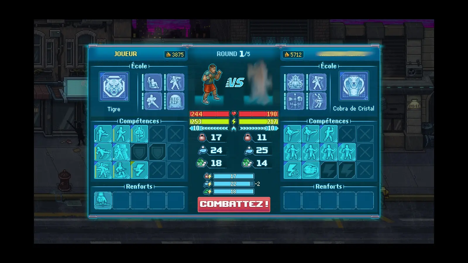 On the left side, this is your fighter’s sheet. You can choose your school and your skills. If you have active reinforcements, it’ll be displayed here too. On the right side, you can see ennemy’s informations : stats, school, passives, skills, reinforcements, etc. note that some ennemies have custom school, skills and passives. Be sure to always check ennemy information and build your strategy around it.