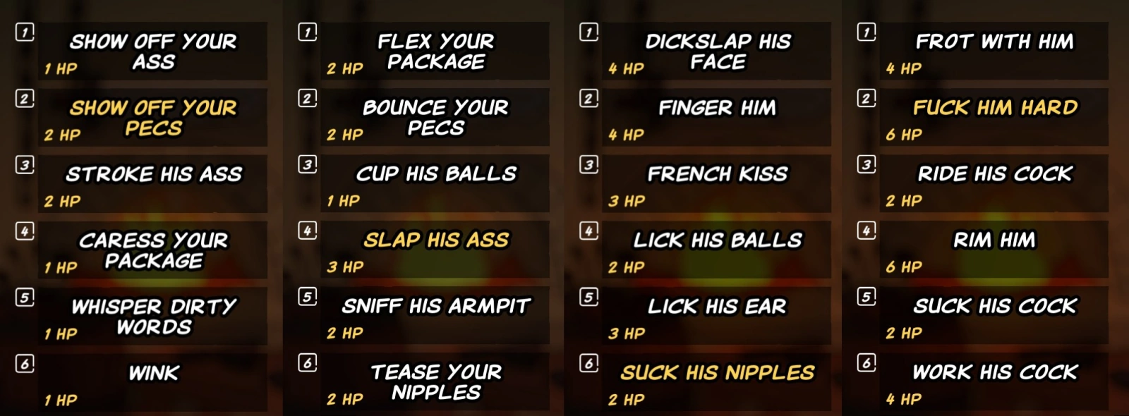 The photo below shows the four waves of options during a duel with a character. The attack with the biggest effect is highlighted. The example given is for Hanth, but the strong attack varies with each character.