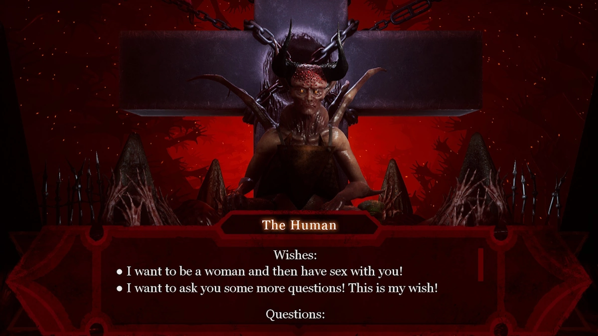 When you get to hell, you are met by a succubus, which then leads you to the Devil. After talking with him, you realize that you (the main character) are not the best person and now the Devil wants to play a game with you, you need to find a way out of the mazes, and after each he will fulfill your one wish and answer several questions. Having finished the conversation, you go on your wandering