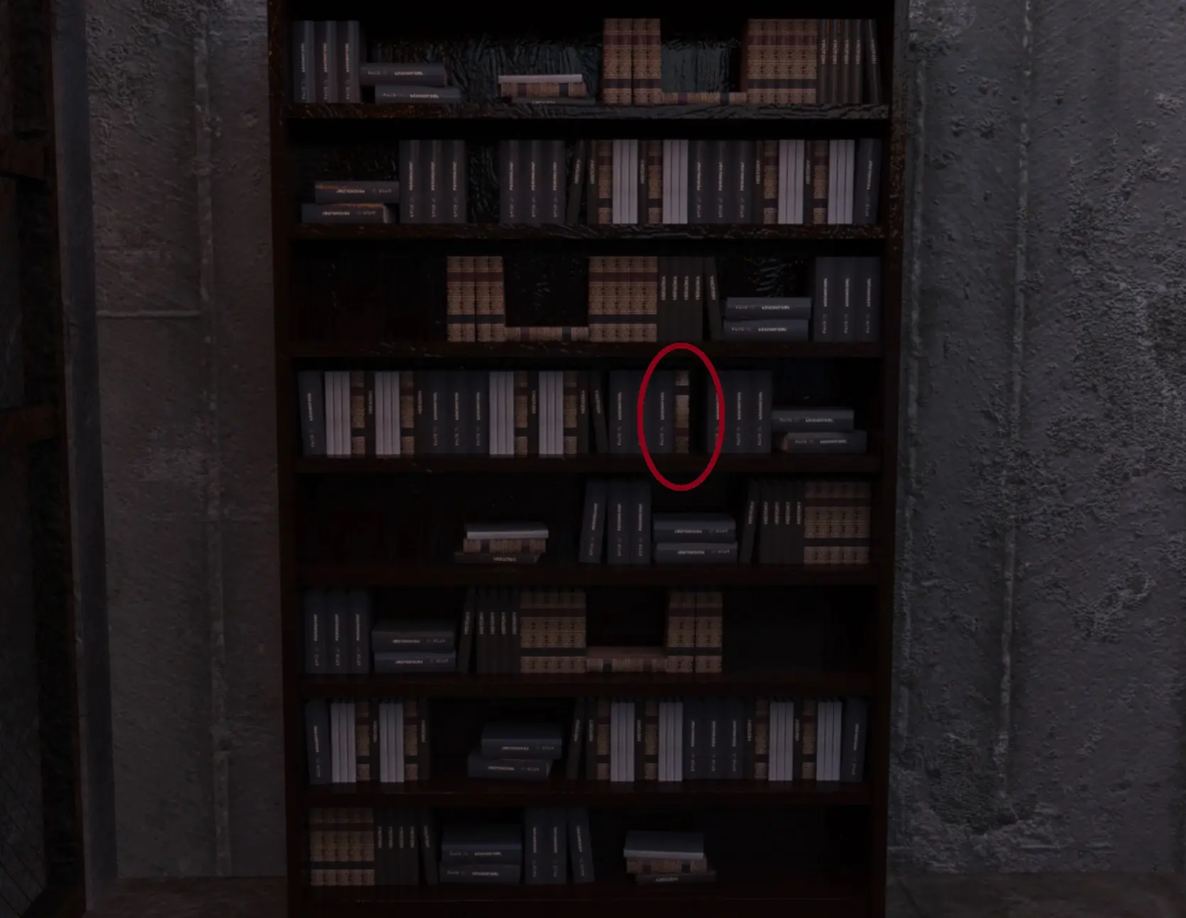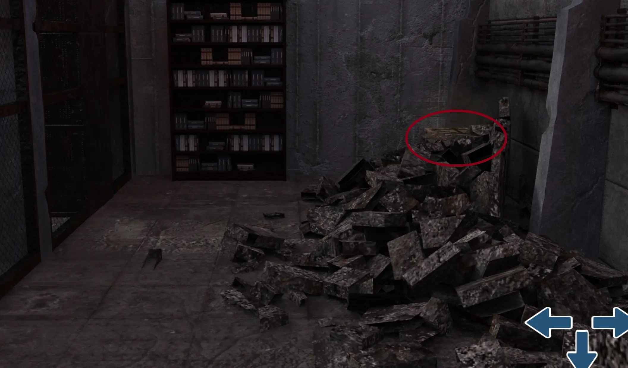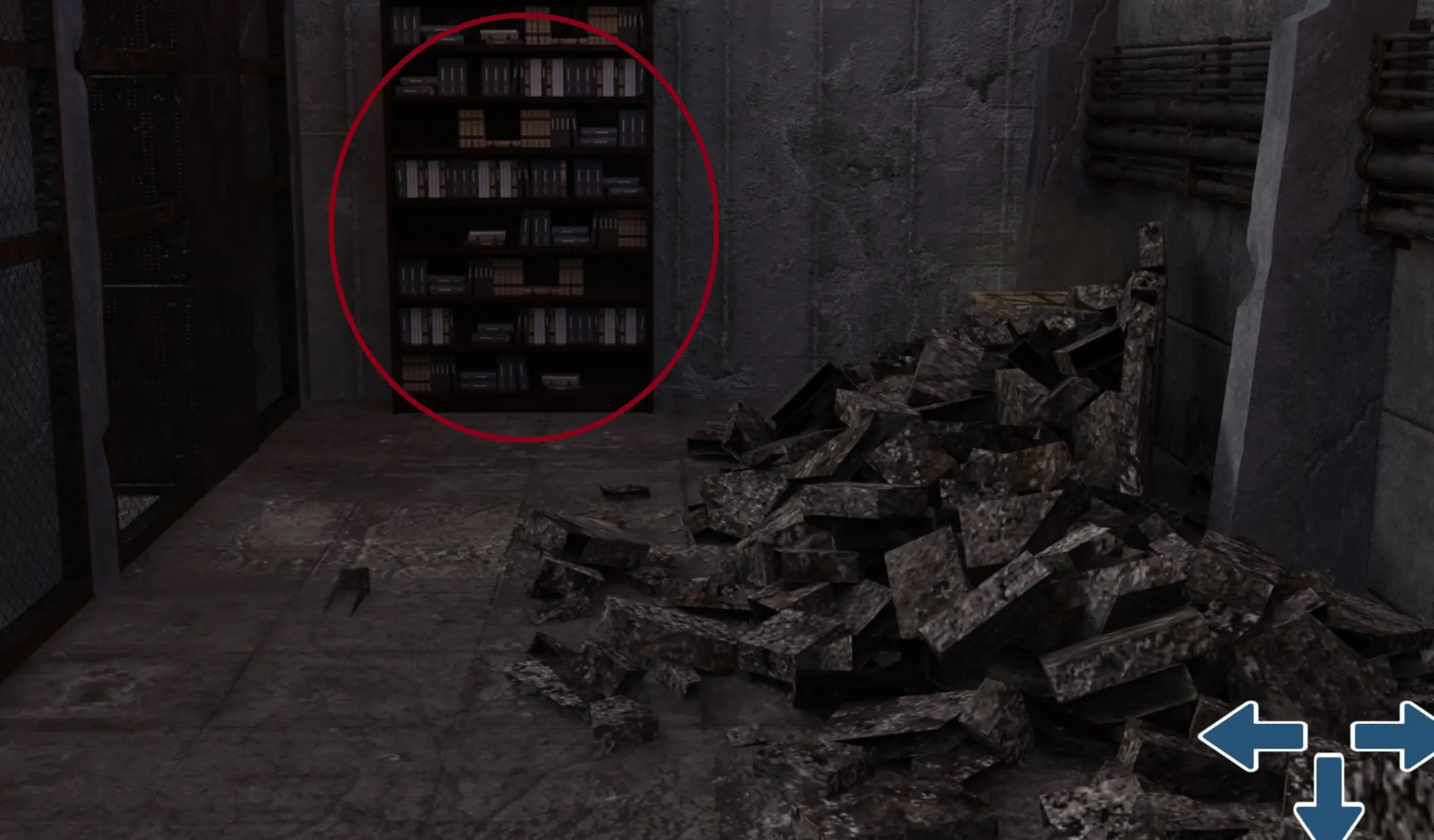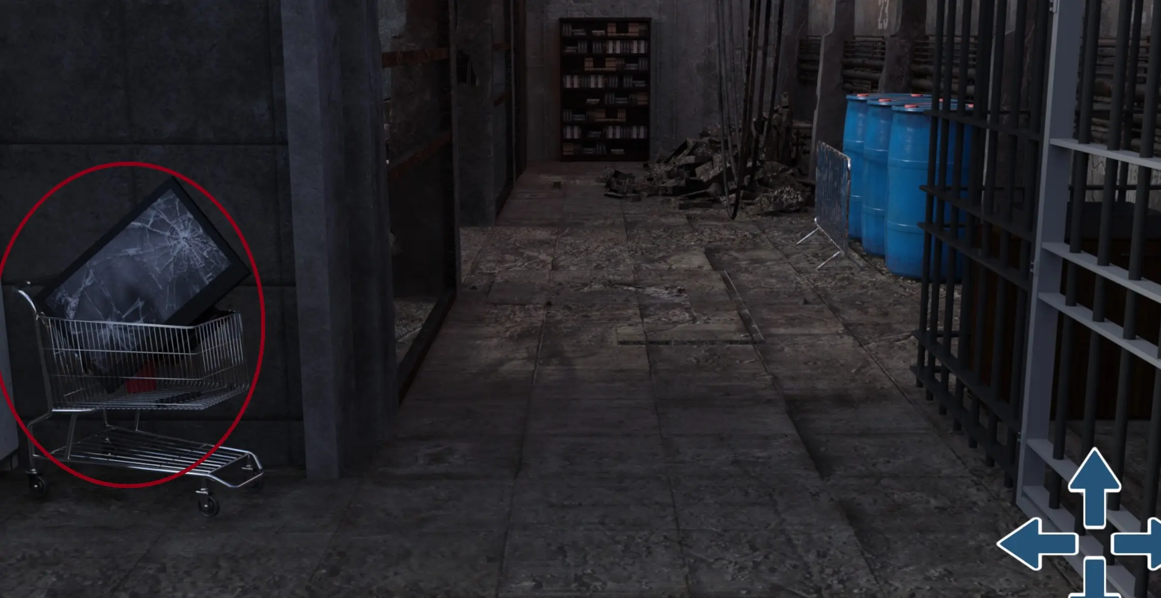 - Turn Left 2 times. Looking at the blue barrels, go up, then turn left. Click on the bookcase to go closer to it.
