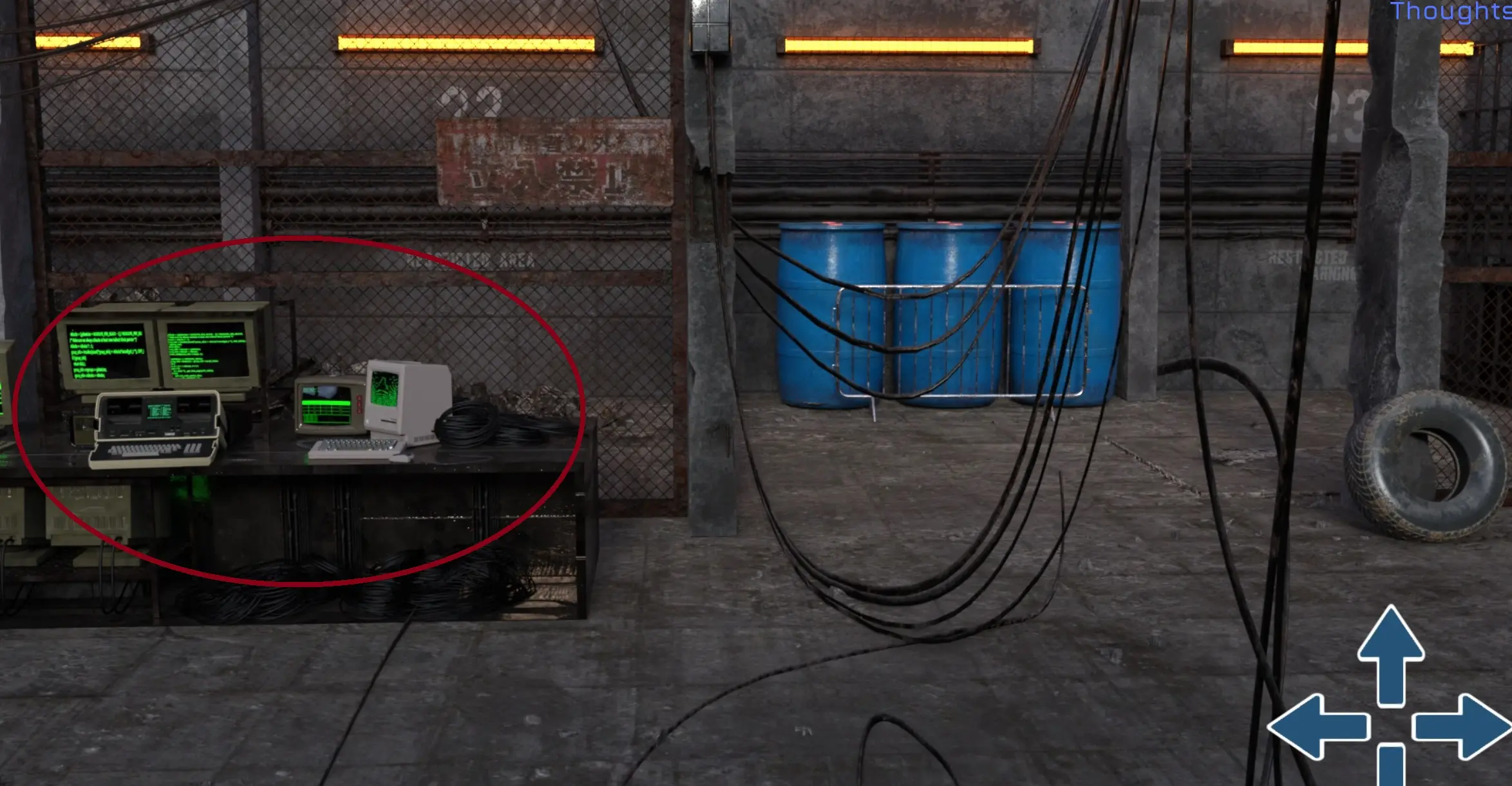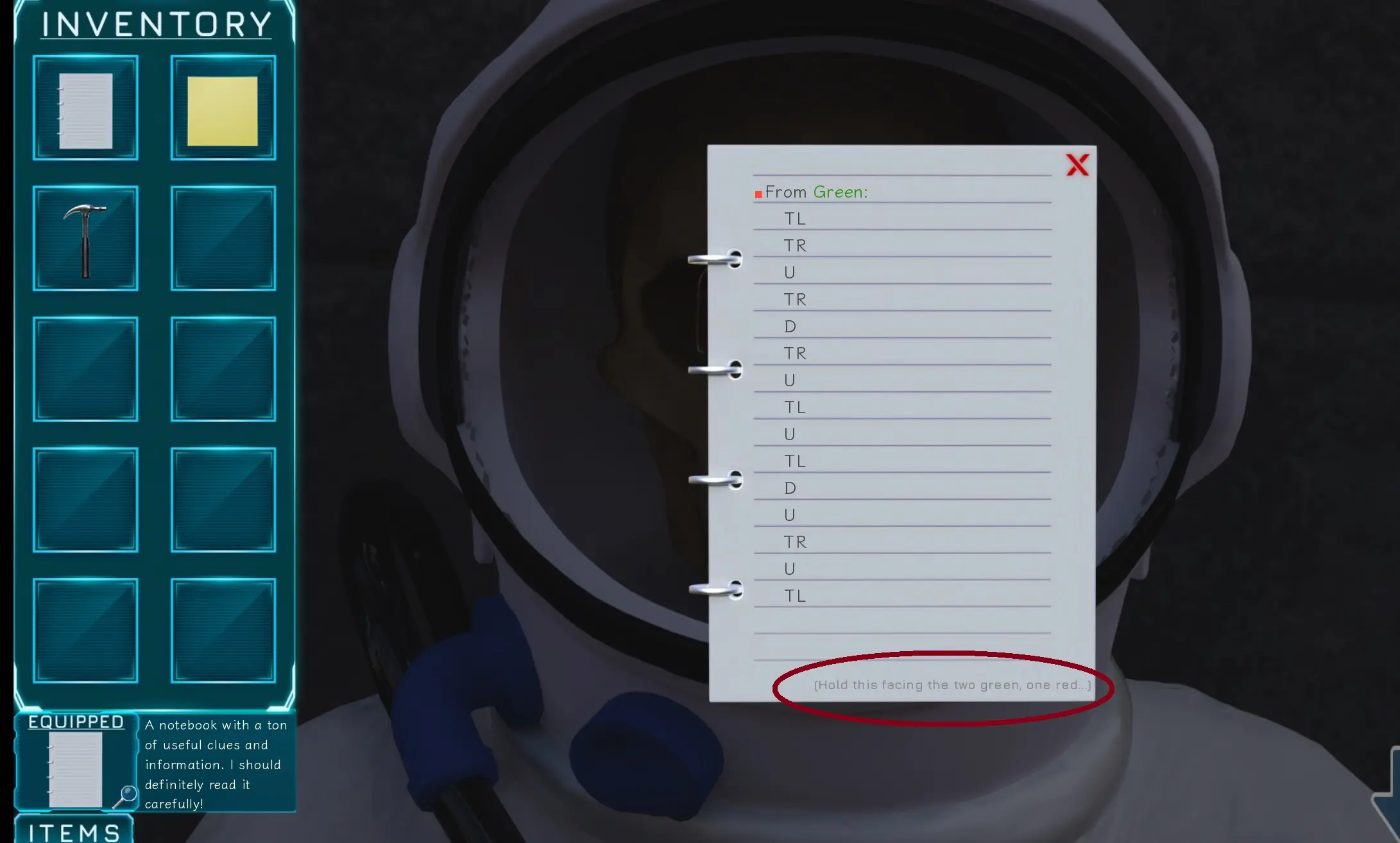 Click the backward arrow to look up. The MC will be facing the table with computers and space suit. - Now follow the path that the notebook describes. (Taking a screenshot of the path, and alt-tabbing to it can save you clicks. Alternatively, you can leave the inventory screen open.)