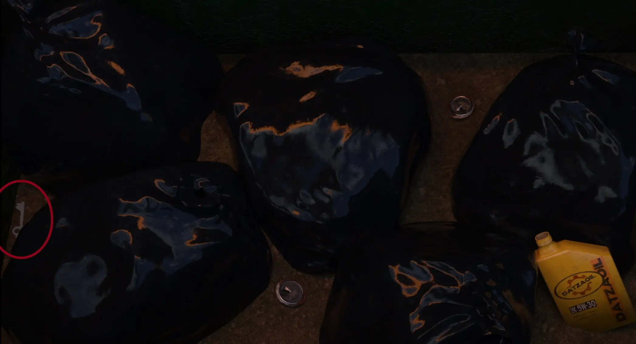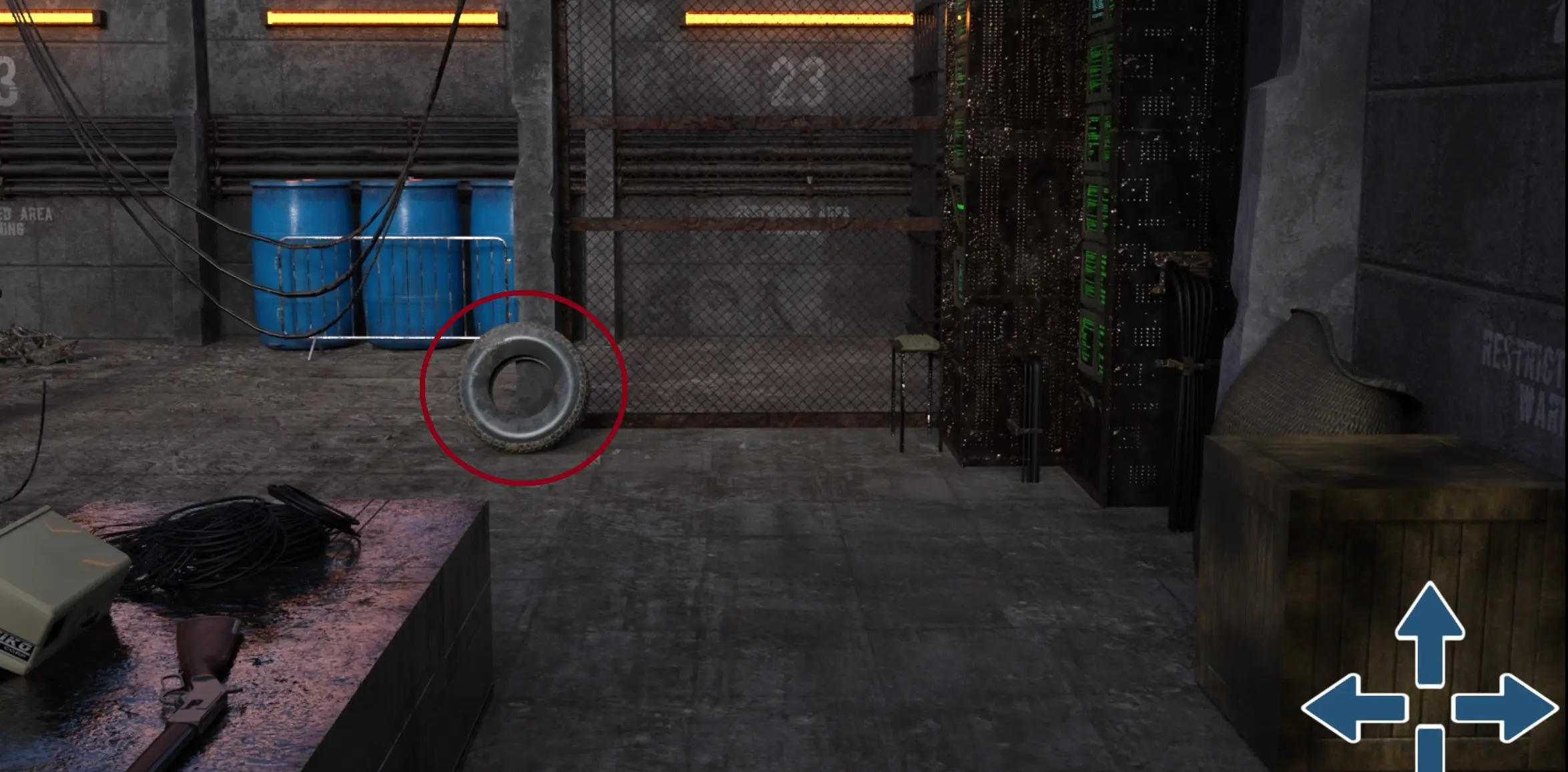 - From the entrance, go up two times, turn left, click on the tire to examine it.