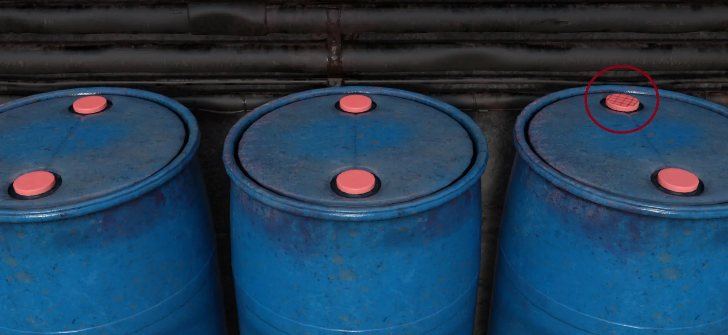 - Go back twice, then go forward. Examine the blue barrels.