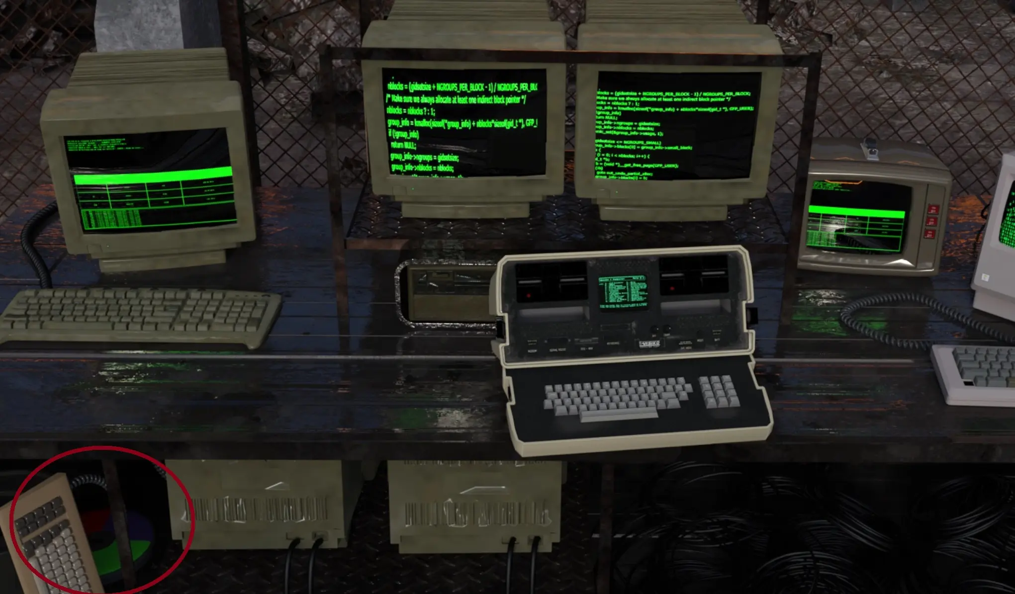 - Go back to the entrance (left, up, left, up, left, up, right, right) and click the table with the computers.