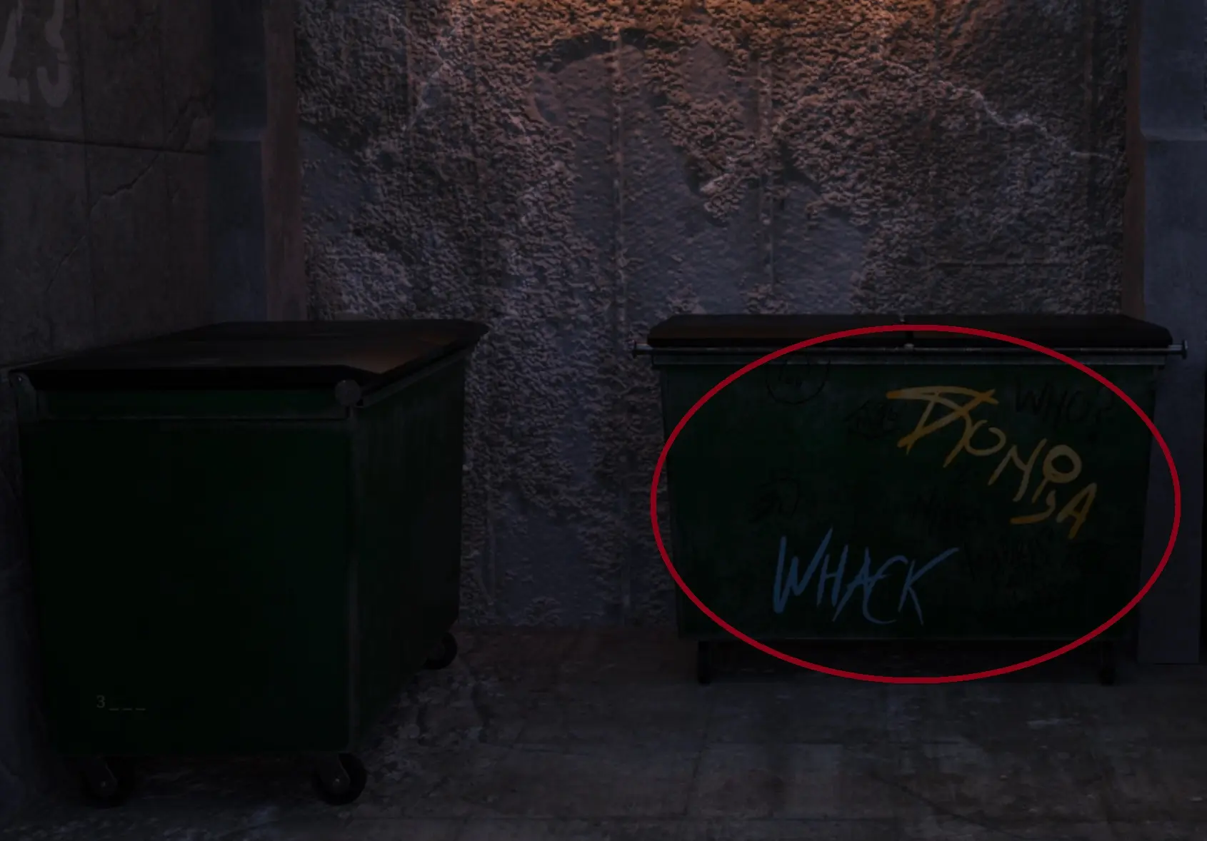 - Go back, turn right and you’ll be facing 3 containers (2 green, one red). The MC will make a remark about the notebook, and that he can now move forward.