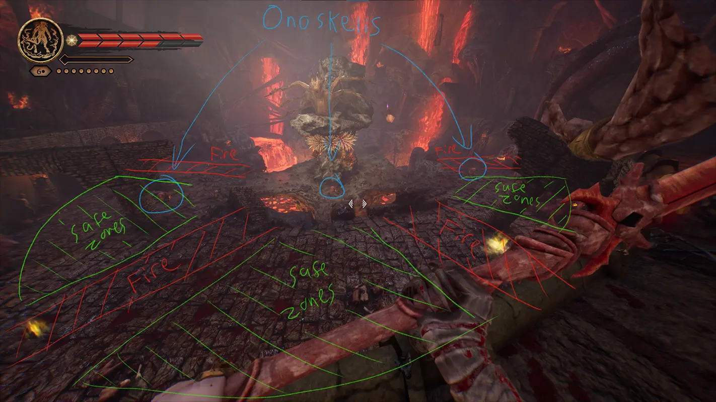 This should be easy, so long as you make sure to single out the spider(s) quickly, and keep an eye out for the Onoskelis fireballs (take them out as soon as you get the chance). - Next, the key is to immediately rush to the opposite end of the room (where the path opens once all enemies are defeated) and kill all the Zombies that spawn there.