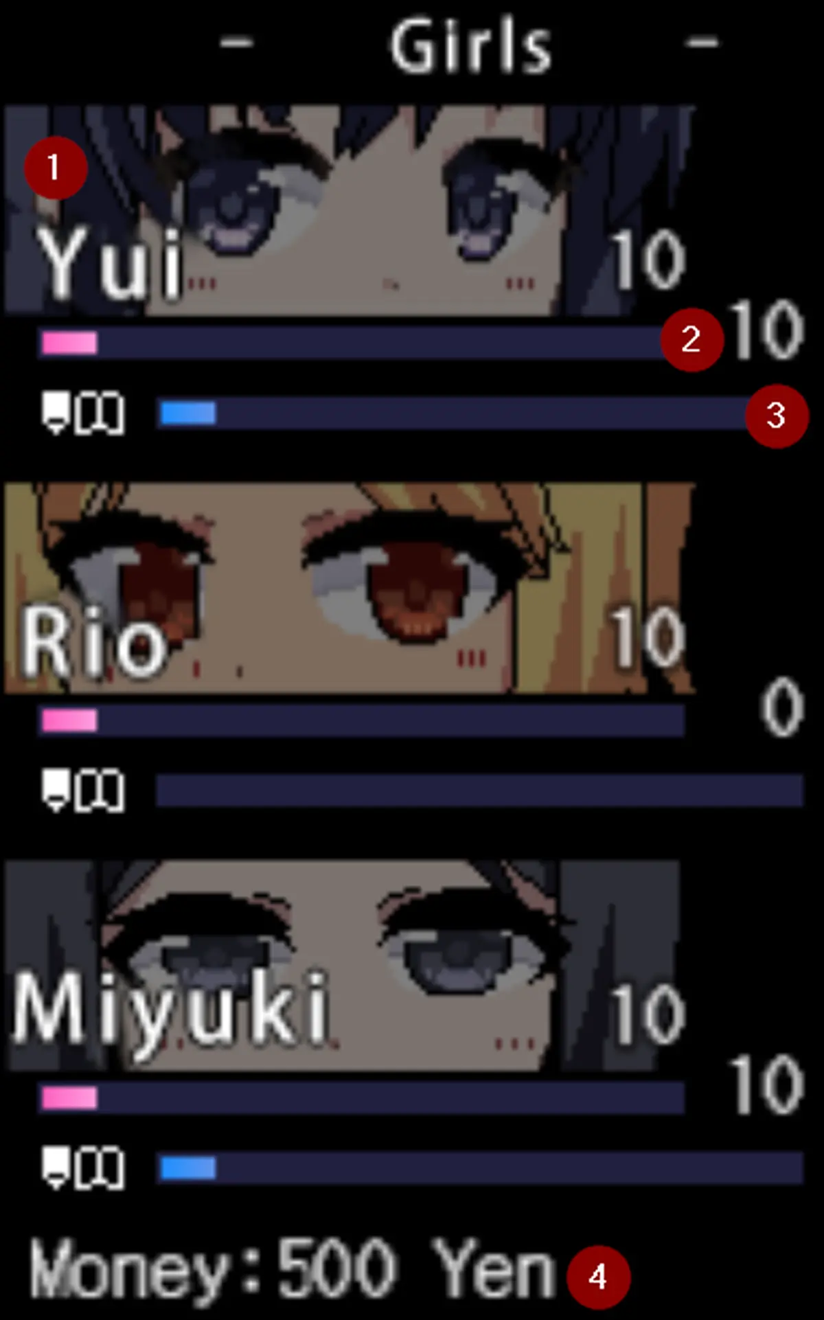 On the right side of the screen you have the status of the girls, your cash on hand, and a map of the house.