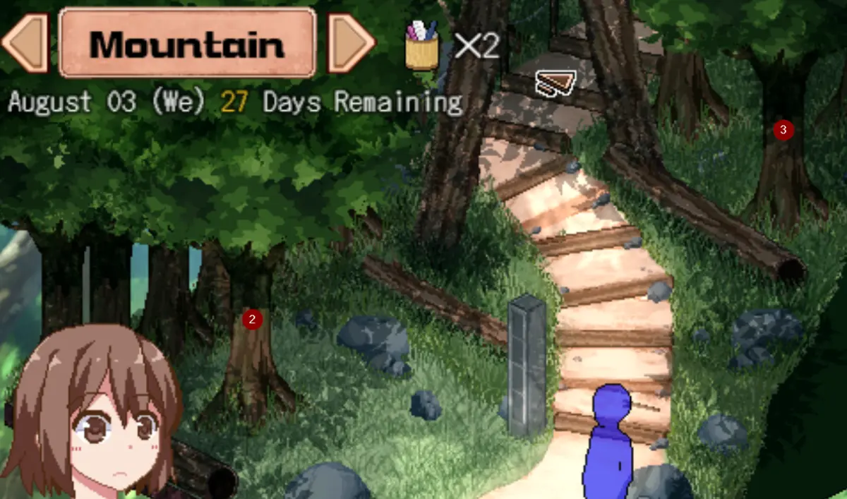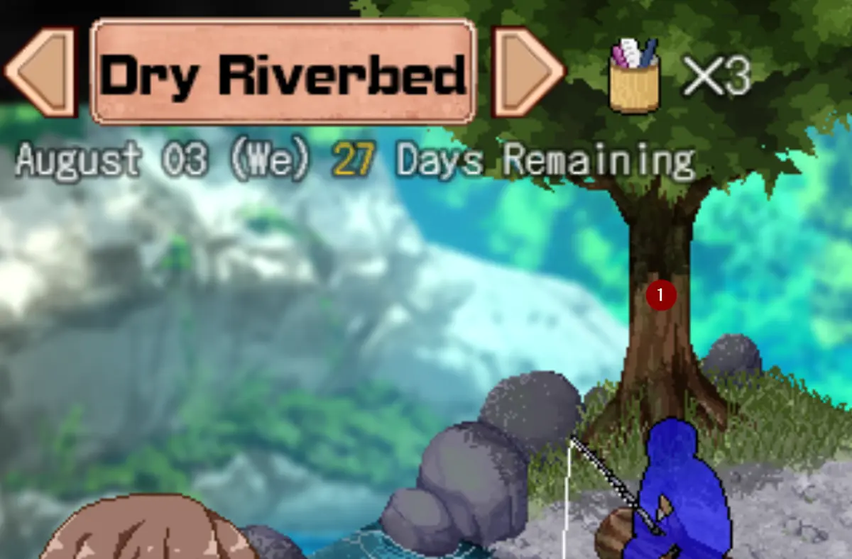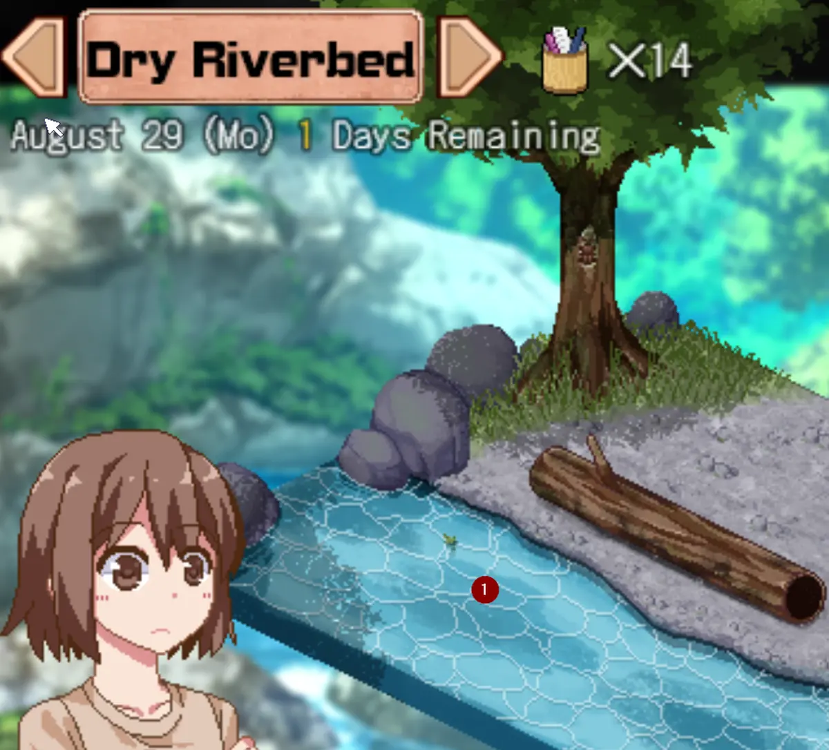 Collecting Bugs is the recommended way to advance Independent Studies until you get the hang of fishing as there is no chance involved. Collecting Bugs will also allow you to generate income starting on Day 16, by selling them to Suzuka. Place the Bug Jelly and come back the next day to collect. You need to purchase Bug Jelly for 50 Yen. You then place the Bug Jelly on a tree and come back the next day to collect your bug(s). There are three trees where you can use the Bug Jelly, you will catch level 1 and 2 bugs here. The first tree is by the Dry Riverbed and the other two are in the Mountain, where you will catch level 2, level 3 and level 4 bugs. Placing the Bug Jelly will use one Action Point per tree. Collecting the bugs is a free action.