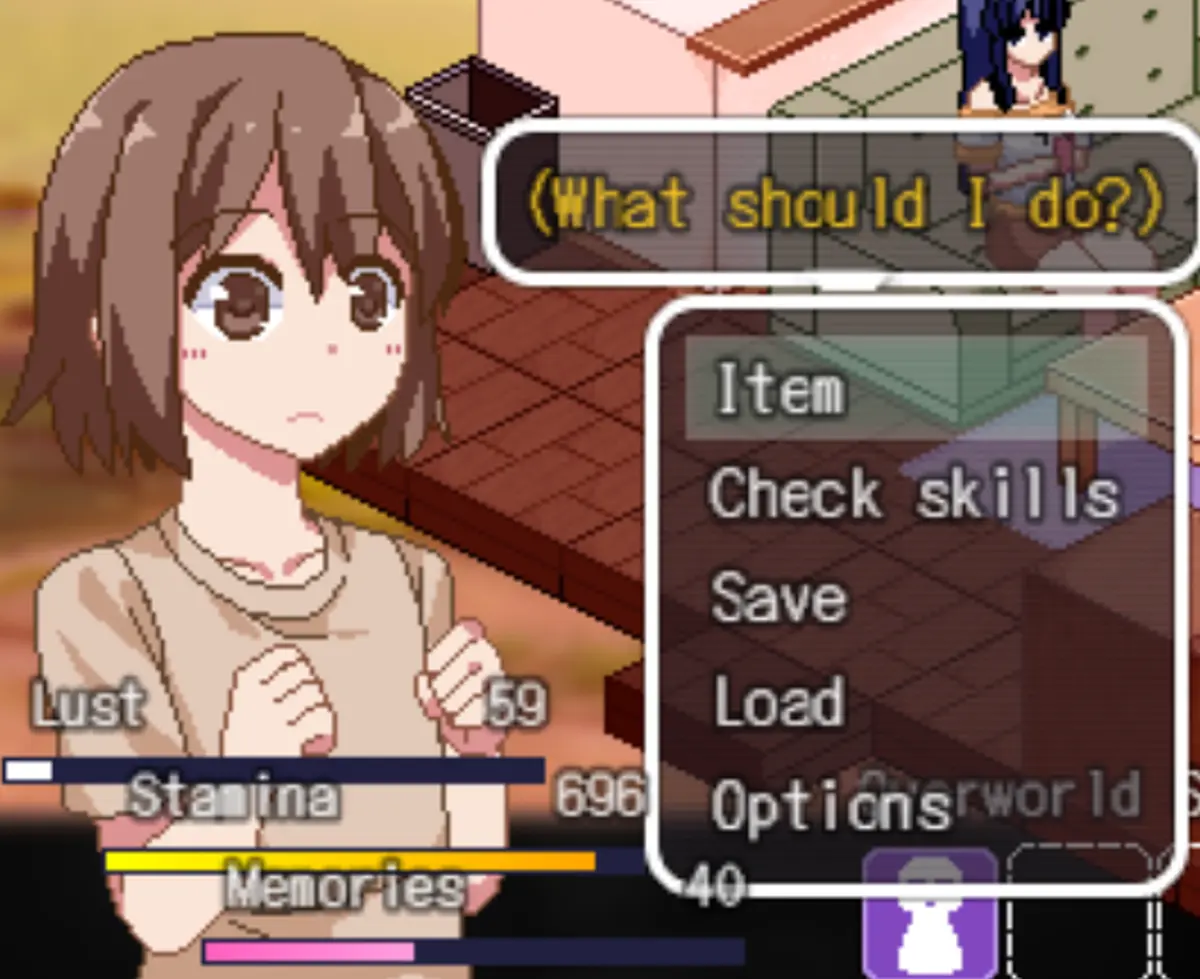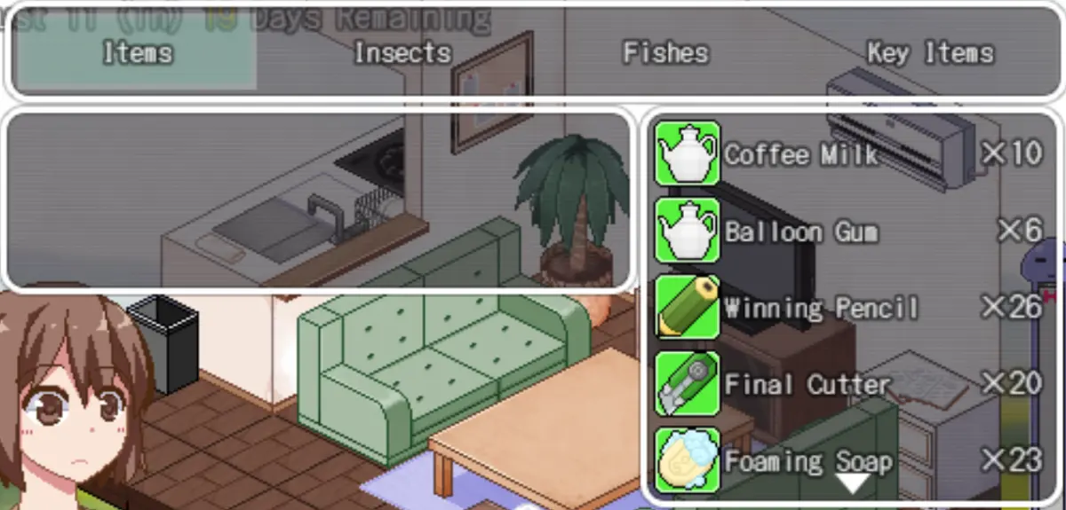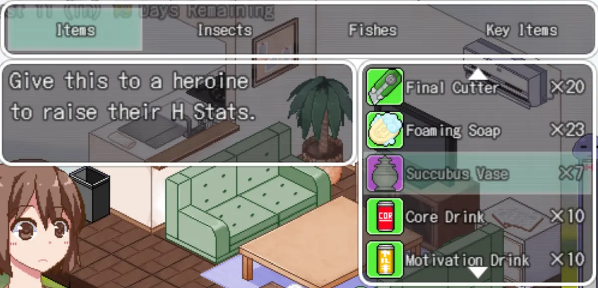 Select Items from the menu. This will show you your inventory. You can then select Items (the most useful option), Insects, Fishes, and Key Items (the panties of girls you’ve had sex with)