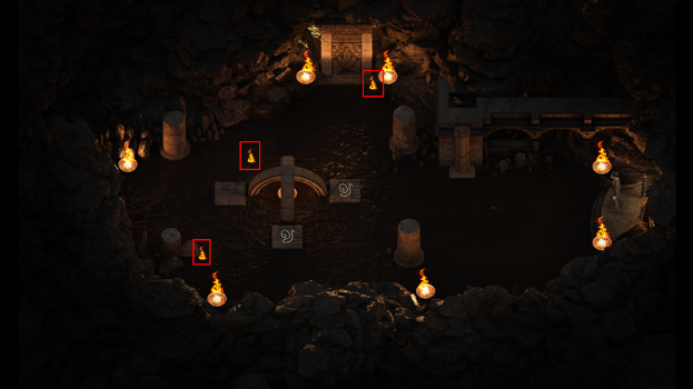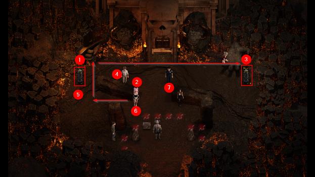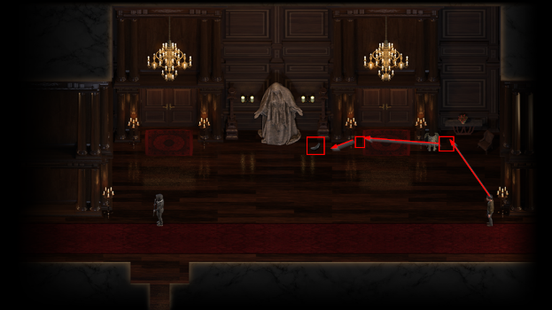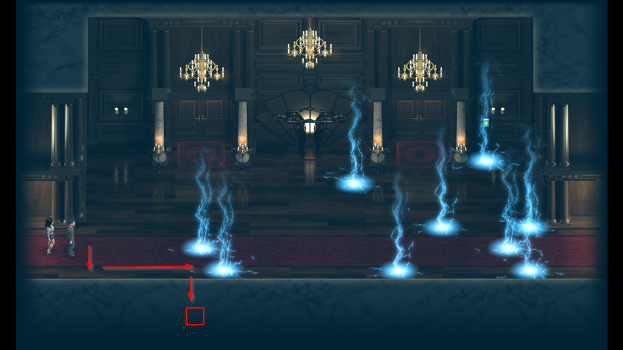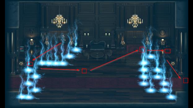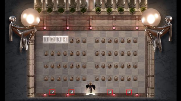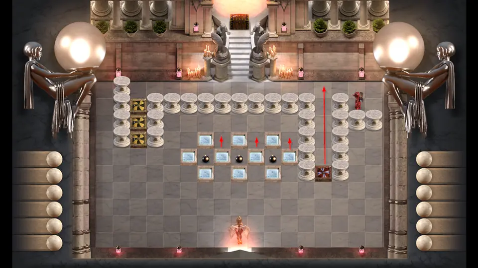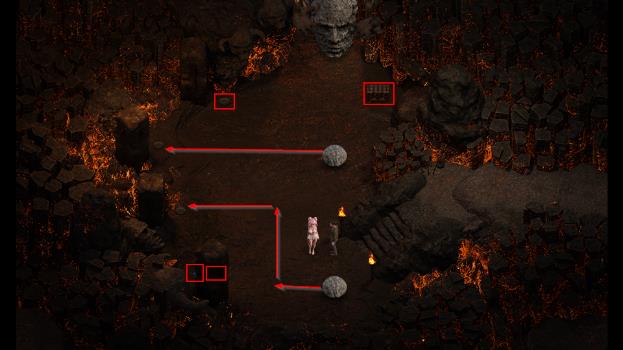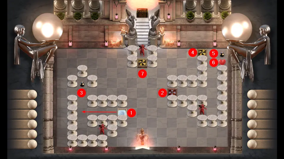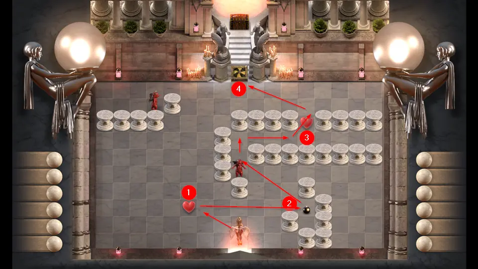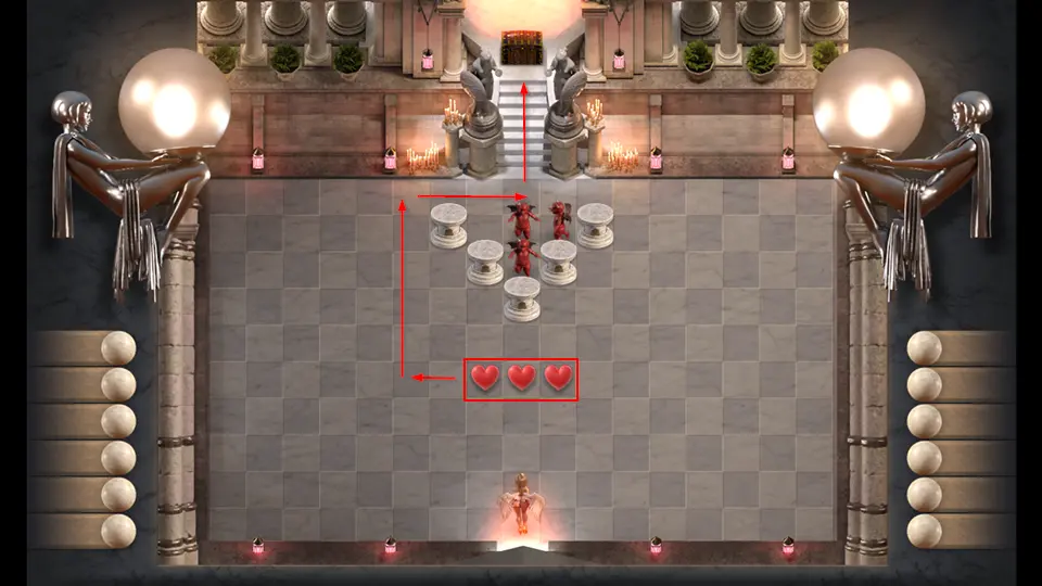 These puzzles are both similar and different from the Treasure of Nadia puzzles. In this puzzle you need to pick up the three hearts, one for each demon. Then walk to the chest. You will lose one heat each time a demon touches you and the demon will disappear. If you don’t have an available heart you will fail the puzzle and have to start over.