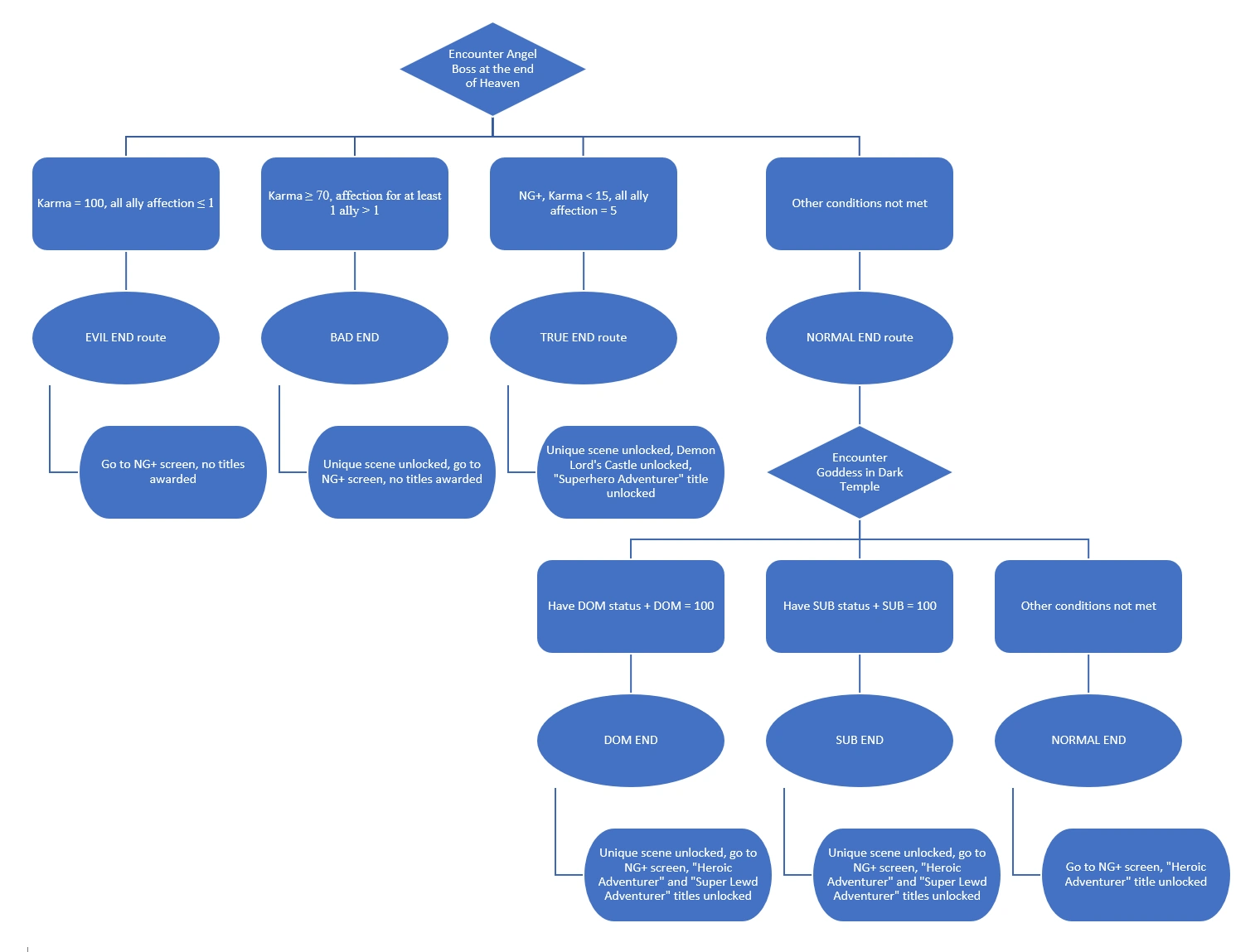 If you don’t meet the requirements for any other route (have Karma < 70), you are locked into the NORMAL END route. You fight the Angel Boss, then have to defeat the Goddess in the Dark Temple. Like with the TRUE END route, you are able to freely complete quests and roam the world until you do this. There are three different endings to this route, depending on your DOM/SUB stats. More information about that in the next section.