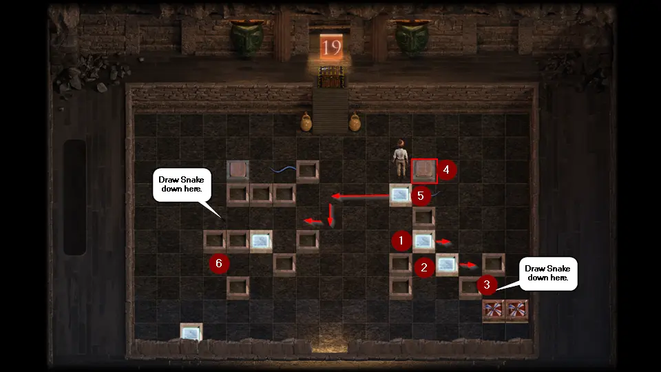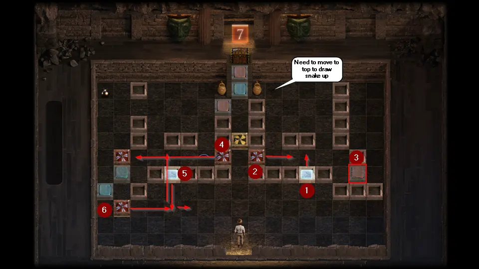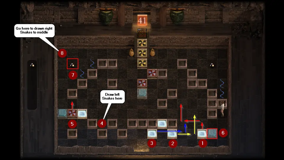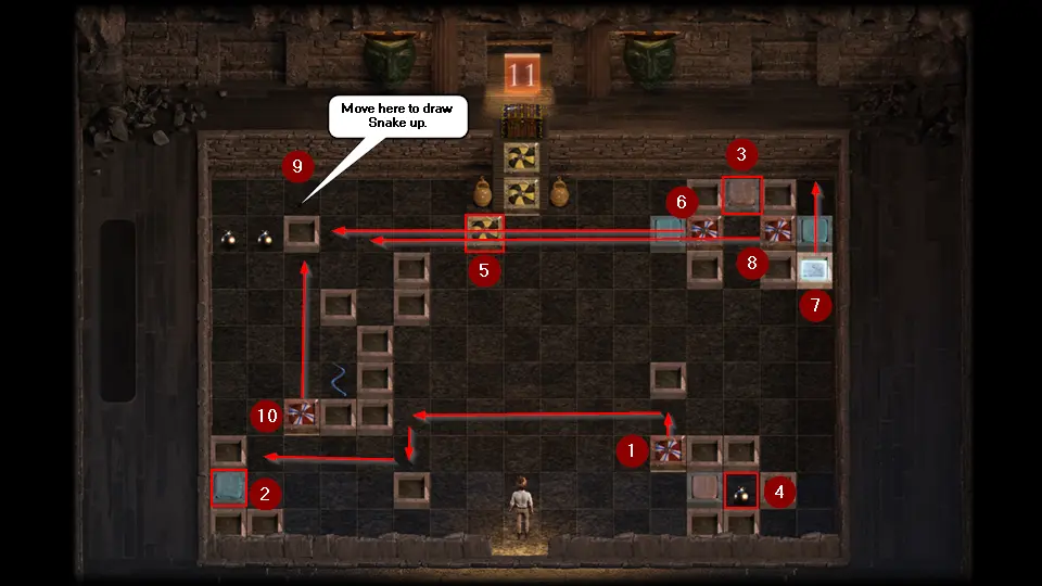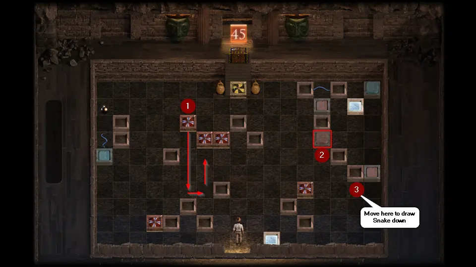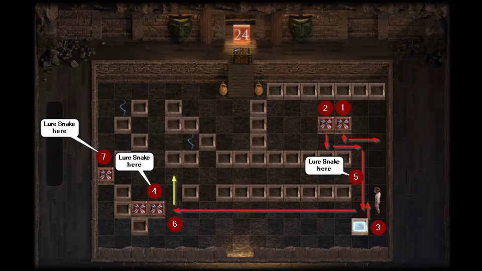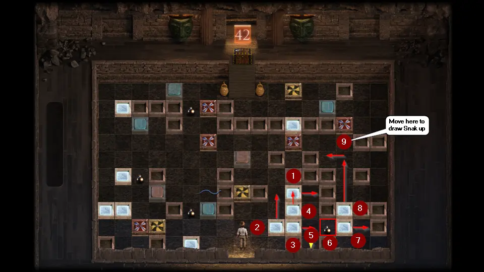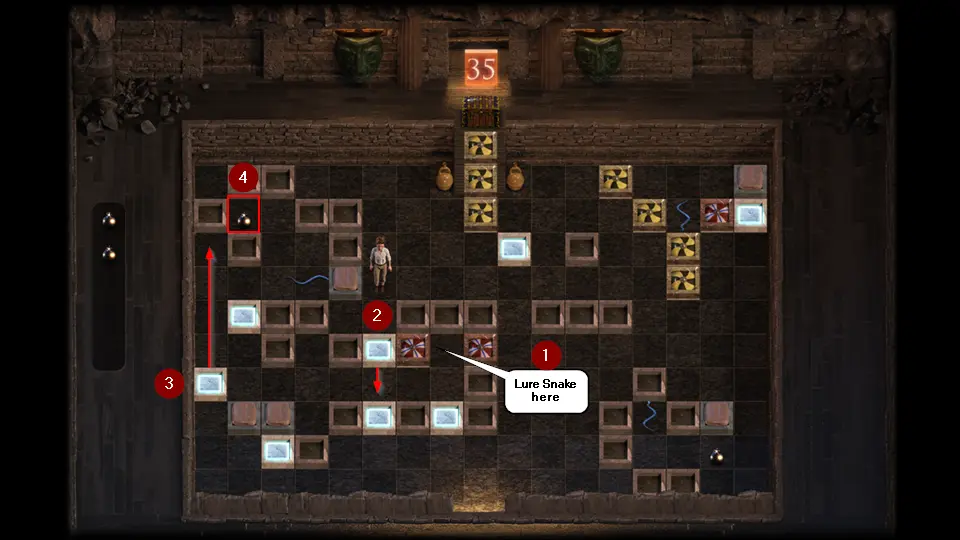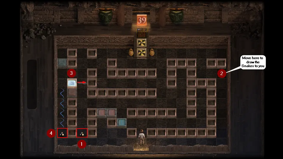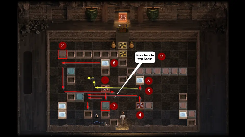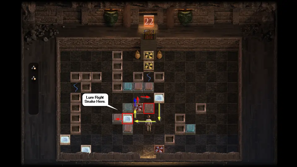 - Stand by the top of the three Sliders to draw the right Snake over, then move down one to trap it.