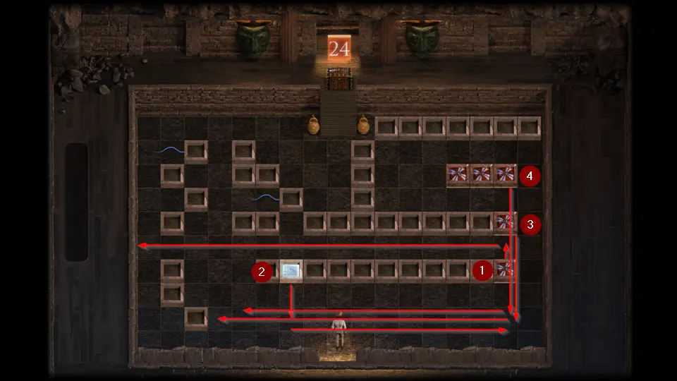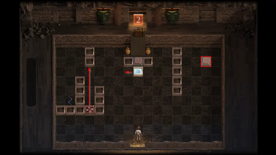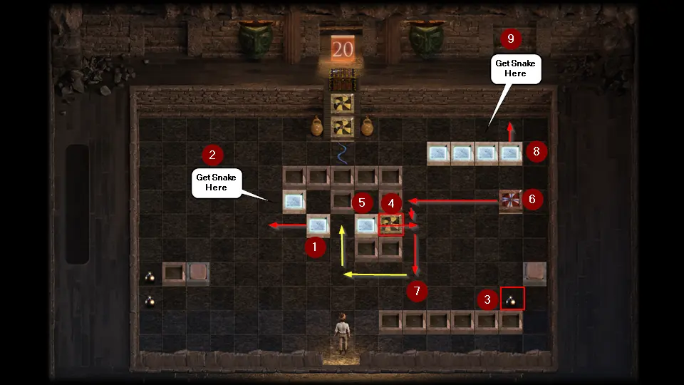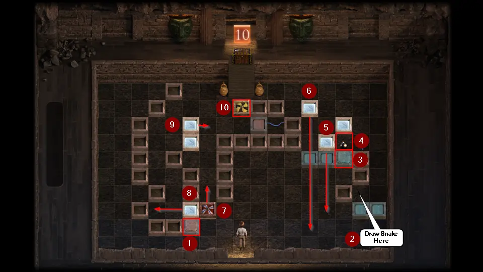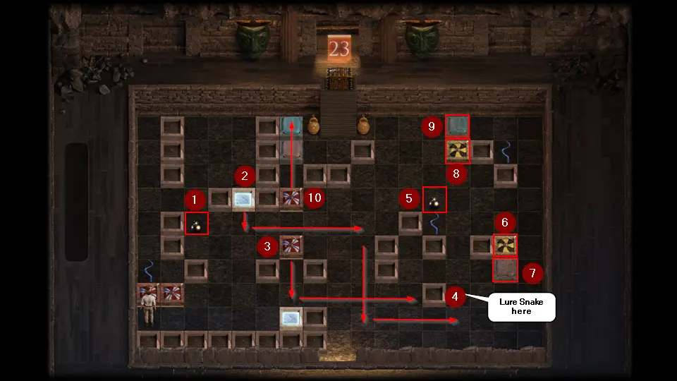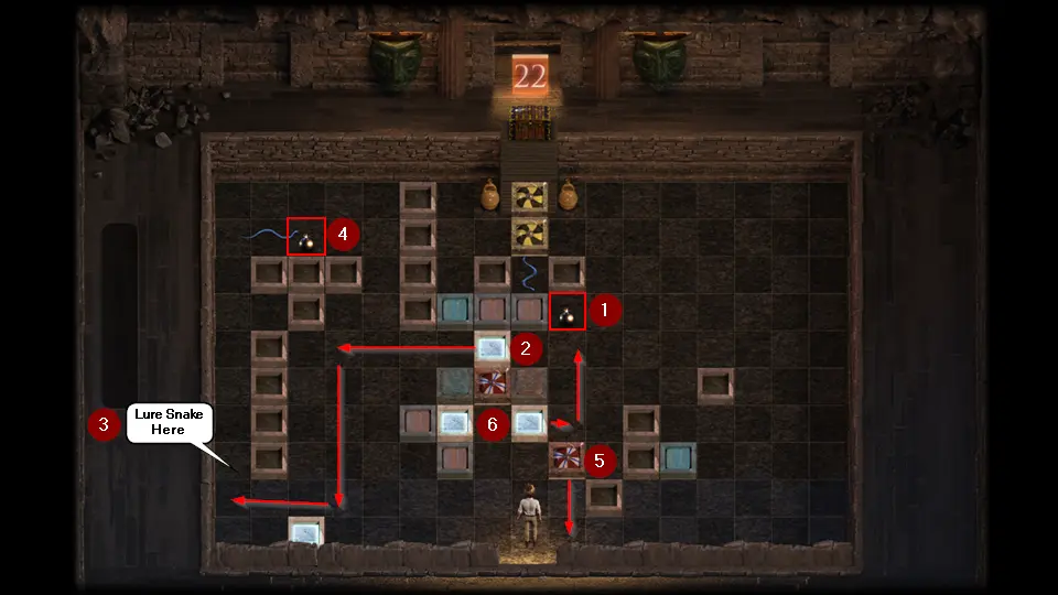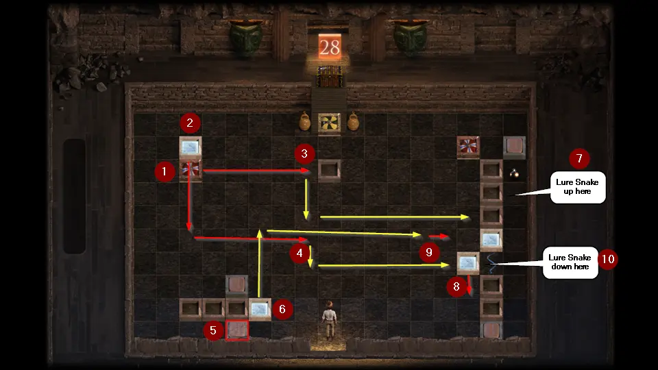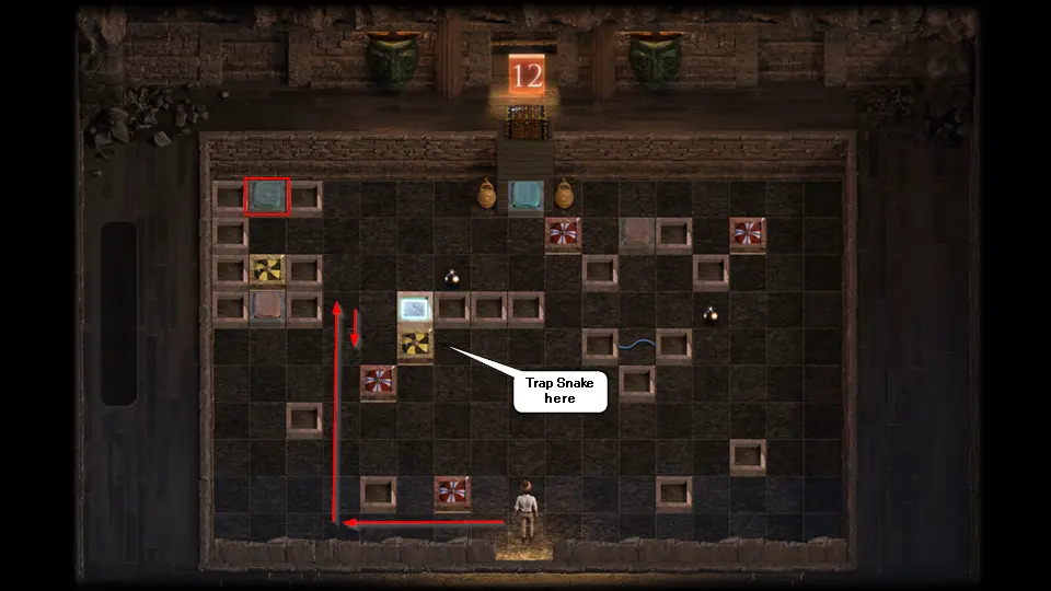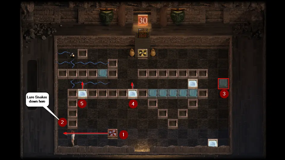 - Move next to the upper Push Block to draw the left Snake into the trap.