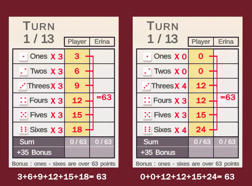 If you look at the second scoreboard in the image above, you can see that there are four Threes and Sixes, so even if the Ones and Twos become 0, you will still achieve 63 points and receive +35 bonus points.